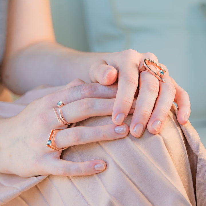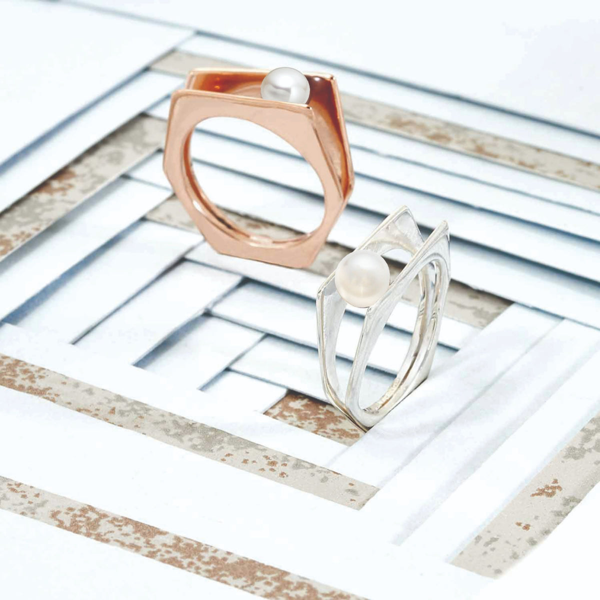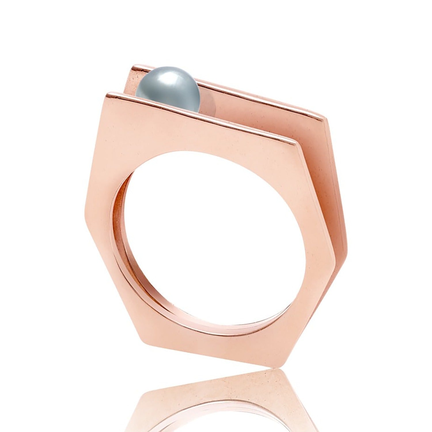 This contemporary ring has an unusual and distinctive design. The ring features a Freshwater Pearl set between two ring bands. The pearl seems to float between the bands, which come together at the base of the ring. The ring has an irregular hexagonal shape. The ring set in 18ct Rose Gold Vermeil on solid Sterling Silver. This original designer piece has been handmade by our artisan craftsmen using only the finest precious metals and authentic Freshwater Pearls with a lovely iridescent silver shine. All our jewellery is ethically made according to strict fair-trade standards. This ring is the perfect gift or treat for you.