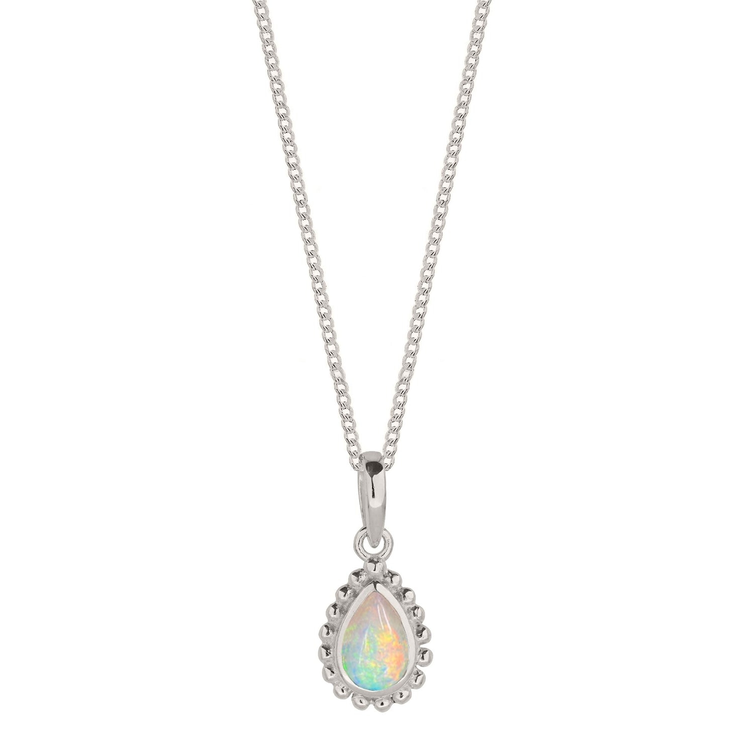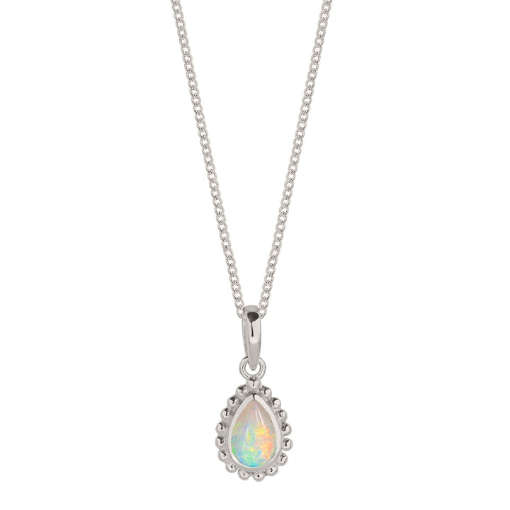 The October Birthstone Sterling Silver Necklace by Charlotte's Web Jewellery is a beautiful and artisanal piece. It features a cabochon opal, October's birthstone, known for creativity and passion. The gem is cradled in a pear-shaped Rawa setting, offering a unique, handmade-in-India twist on traditional birthstone jewelry. The necklace is hypoallergenic and nickel-free.
