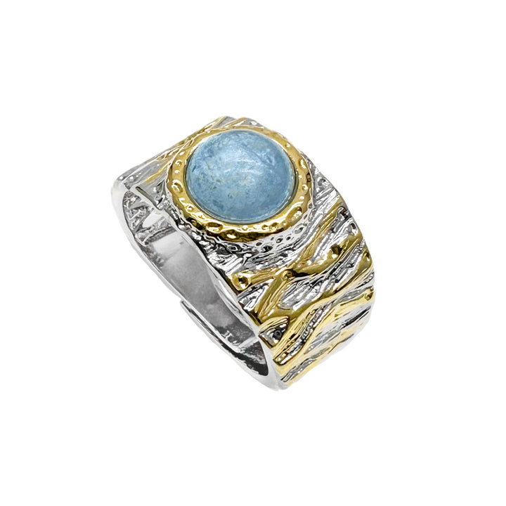This ring features a stunning aquamarine stone set in a platinum-plated brass band. The aquamarine stone, known for its serene blue hues reminiscent of the ocean, creates a captivating centerpiece that reflects light with a radiant sparkle. The adjustable design of the ring ensures a comfortable for various finger sizes, allowing you to wear it with ease and confidence. The band is crafted from high-quality brass and plated with platinum, providing a sleek and luxurious finish that complements the ethereal beauty of the aquamarine stone.
