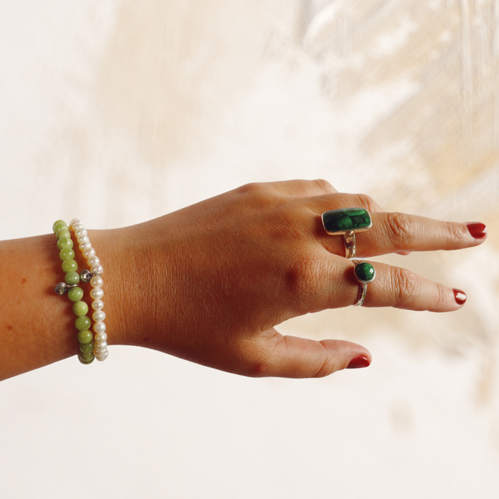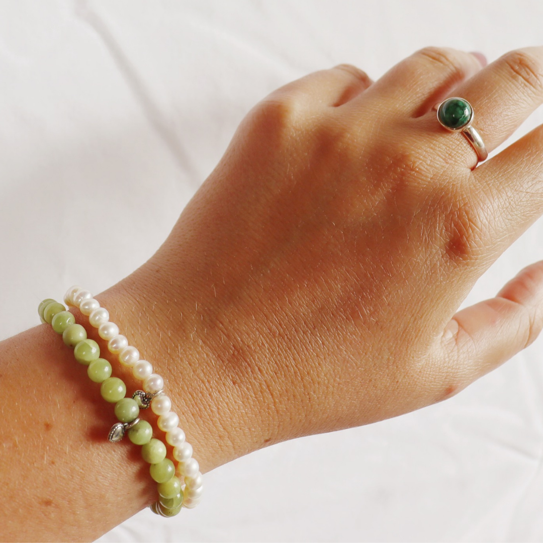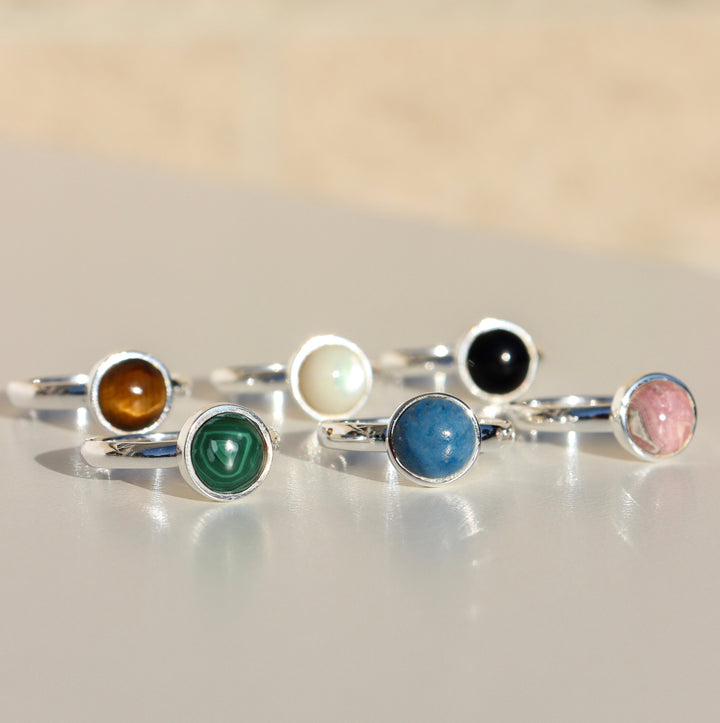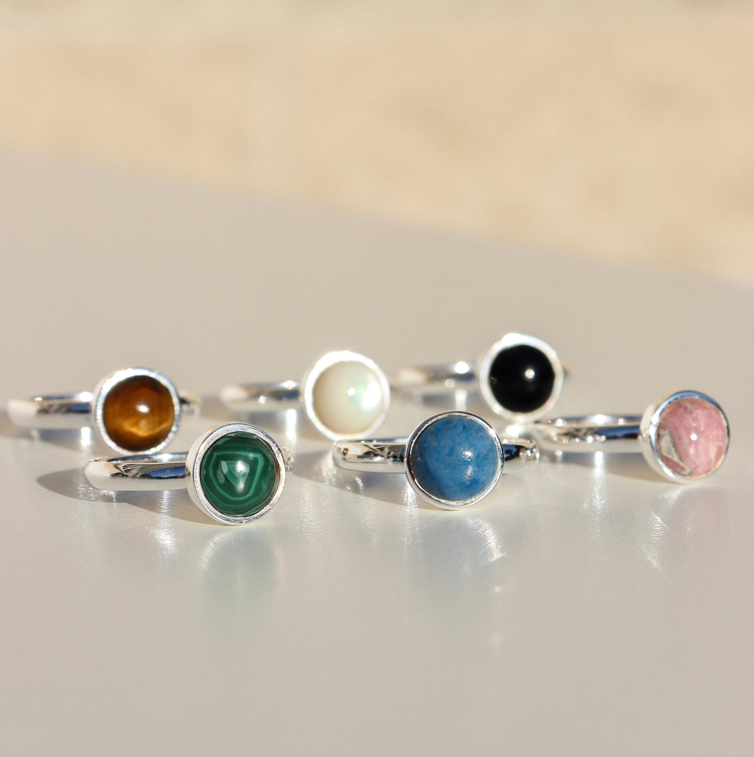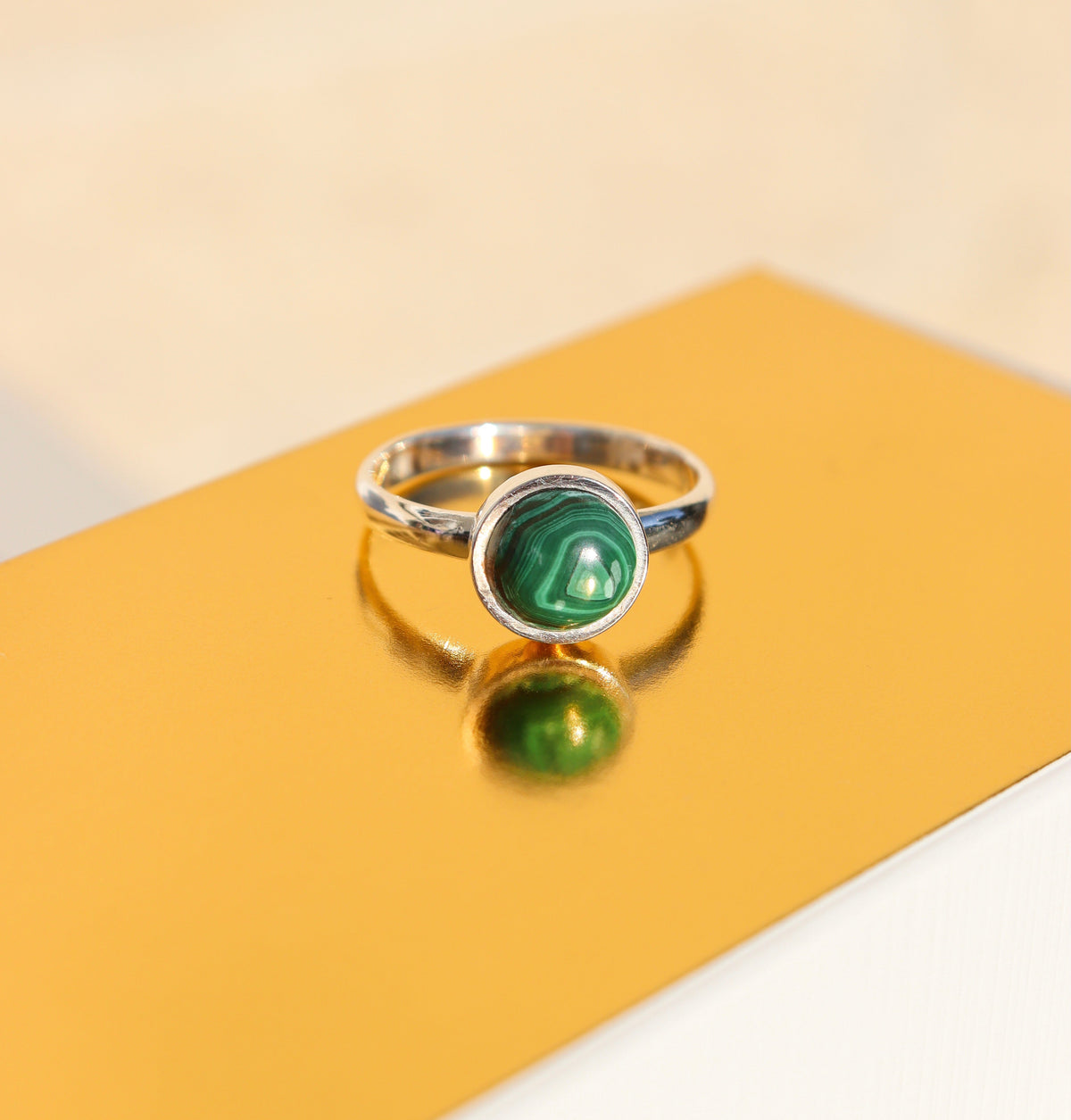A small round cut of the vibrant malachite green stone stands out in this sterling silver ring. This ring can be worn layered with your other sterling silver rings, or on its own for a simple look. We love the array of green tones in the malachite stone. Due to its natural elements each piece is perfectly unique.