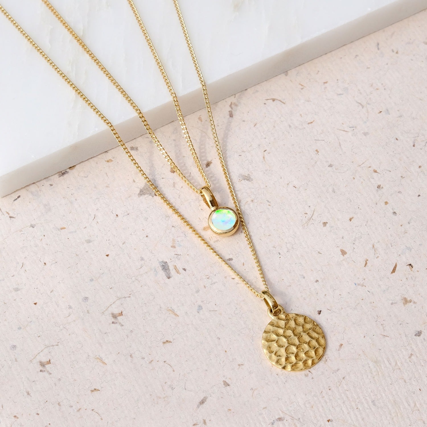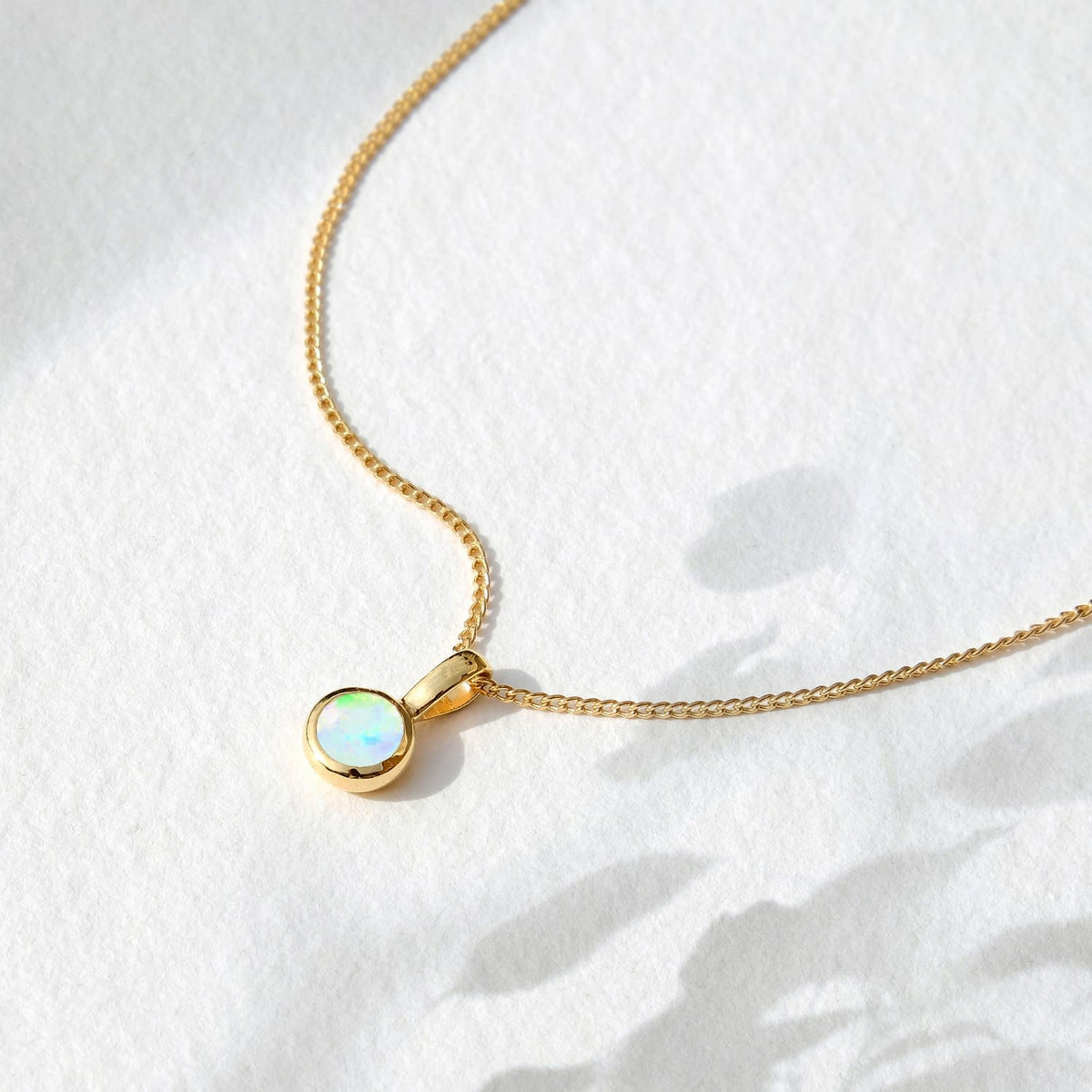 This necklace features a gold-plated pendant set with a cabochon opal. The opal stone measures 5mm and the piece is handmade.