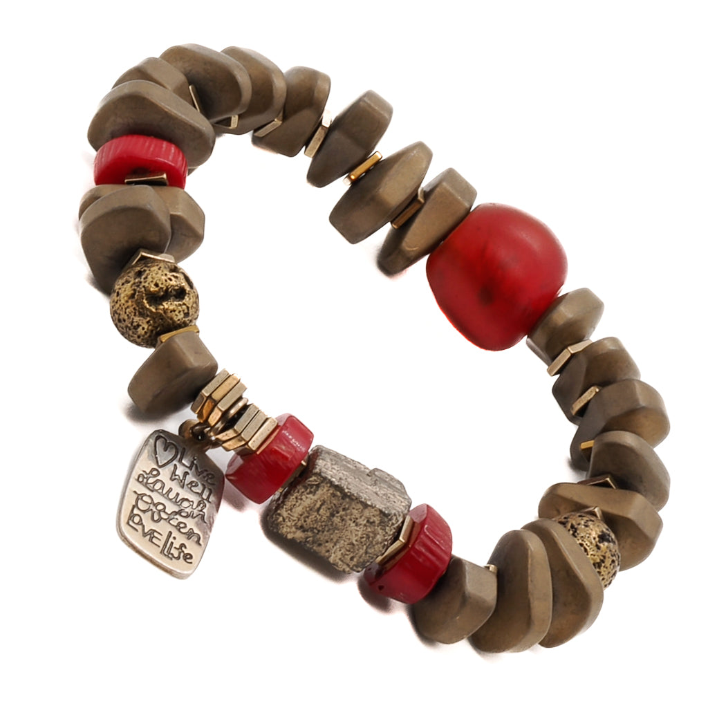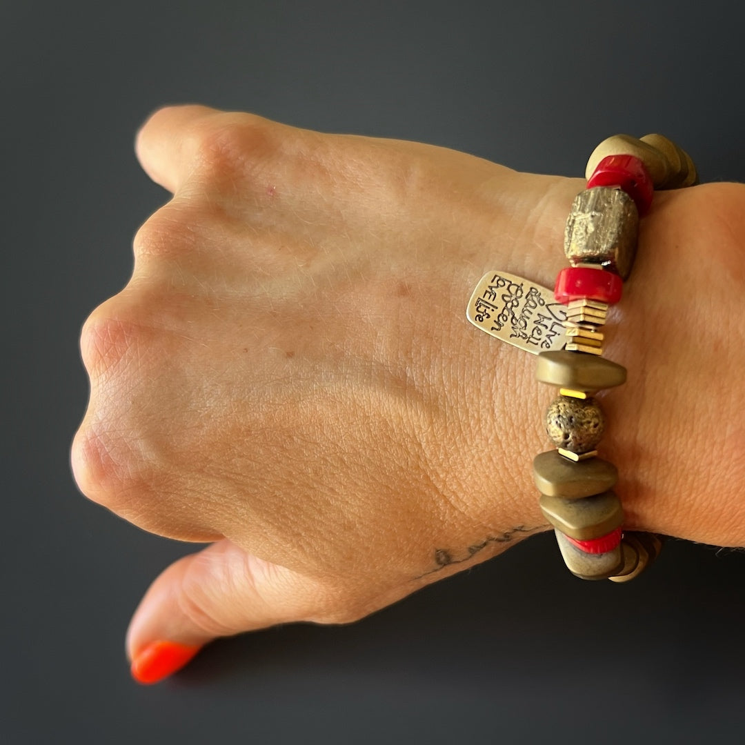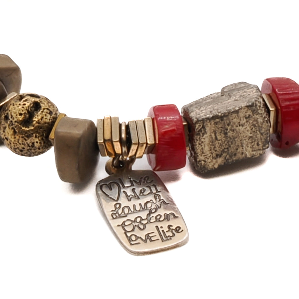 The Love Life Vintage Mantra Bracelet is a beautiful piece of unique jewelry that carries a powerful message and serves as a reminder to appreciate and enjoy life. Handmade Love Life Vintage Mantra Bracelet is a stunning piece of jewelry that features nugget matte gold color hematite beads, known for their grounding and protective properties. The bracelet is also adorned with a gold color pyrite bead, believed to promote prosperity and abundance, and red coral beads that add a pop of color and enhance the overall design Sterling silver on gold plated Live Well Love Often Love Life message charm, serving as a powerful mantra to remind the wearer to live life to the fullest and cherish every moment.