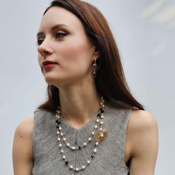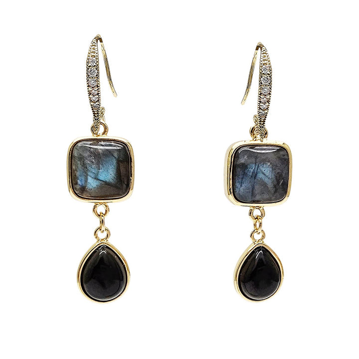 Square-cut labradorite paired with teardrop black obsidian. Set in high-quality brass with gold finish.