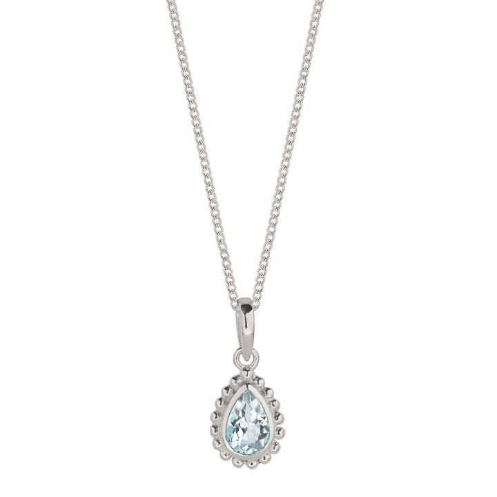This March Birthstone Sterling Silver Necklace - Aquamarine by Charlotte's Web Jewellery is a serene and elegant accessory. The necklace features Aquamarine, the birthstone of March, nestled in a pear-shaped Rawa setting. Aquamarine is a symbol of tranquility and courage. The necklace is handmade from sterling silver and is also hypoallergenic and nickel-free.
