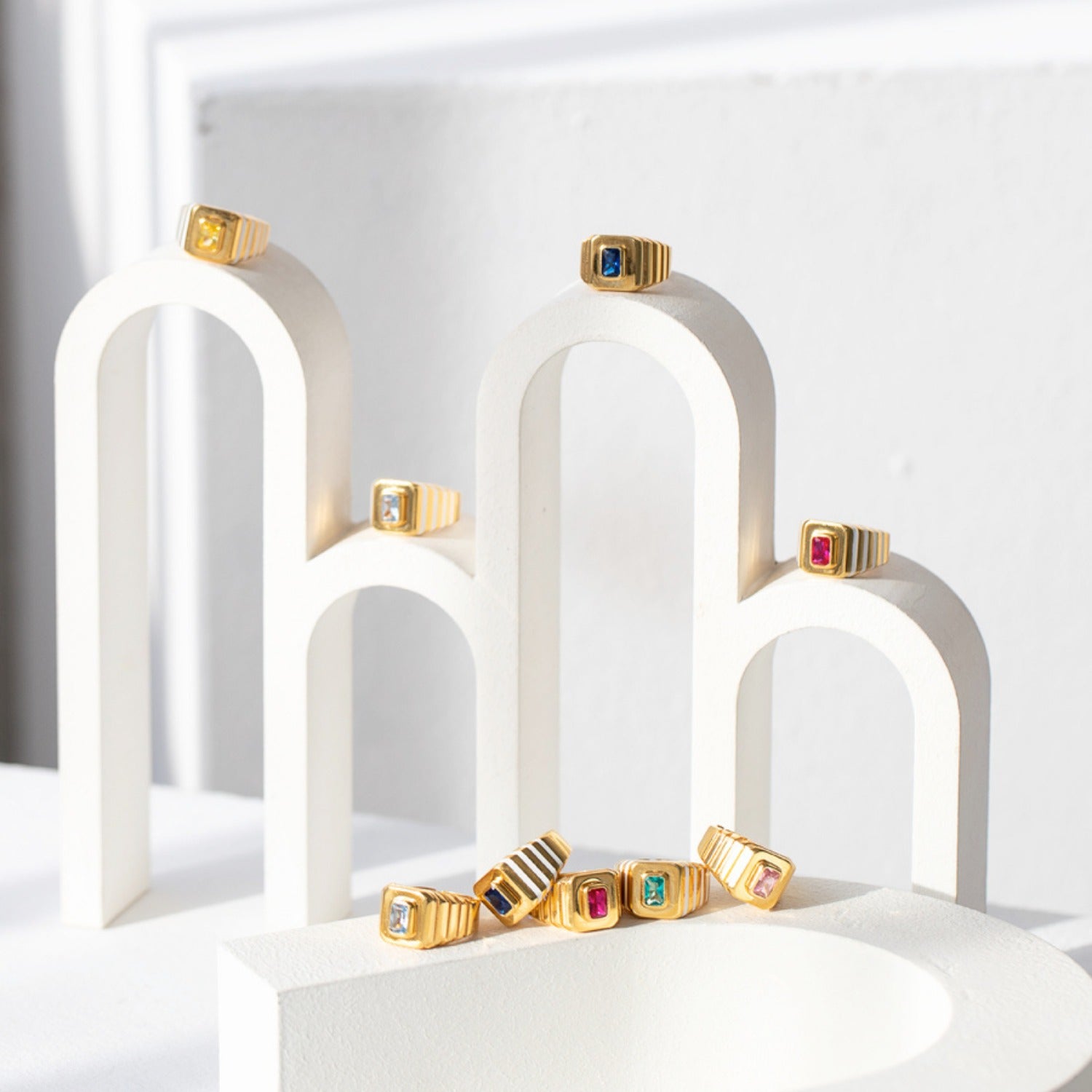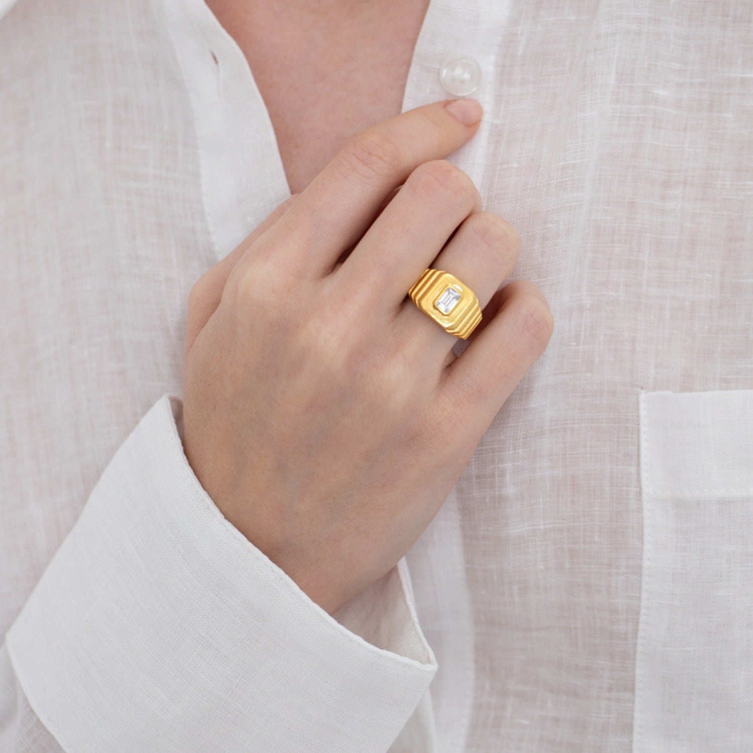 The perfect choice for those who want to have a sparkling style, the Octagon White Stone Ring is designed to emphasize your elegance and unique style. This ring is an impressive piece enriched with details. Octagon cut stones add shine to the ring, while the details on the side of the ring provide a unique touch. This unique combination makes the ring an eye-catching accessory. Thanks to its adjustable design, it adapts to different finger sizes. You can wear it on any finger you want to create your own style. It is plated with 22k gold on high quality 925 sterling silver and provides long-lasting use thanks to its special protection. Octagon cut stones are also resistant to wear and scratches, so your ring will always keep its sparkle.
