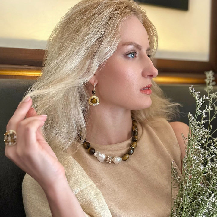 Teardrop Tiger Eye Setting Dangle Earrings by Farra are an exquisite and elegant accessory. They showcase the natural beauty of tiger eye gemstones in a graceful teardrop shape, designed to add a touch of sophistication to any outfit. The captivating beauty and graceful movement of these earrings effortlessly combine the natural allure of tiger eye with a timeless design, making them perfect for enhancing your style and adding a touch of glamour.
