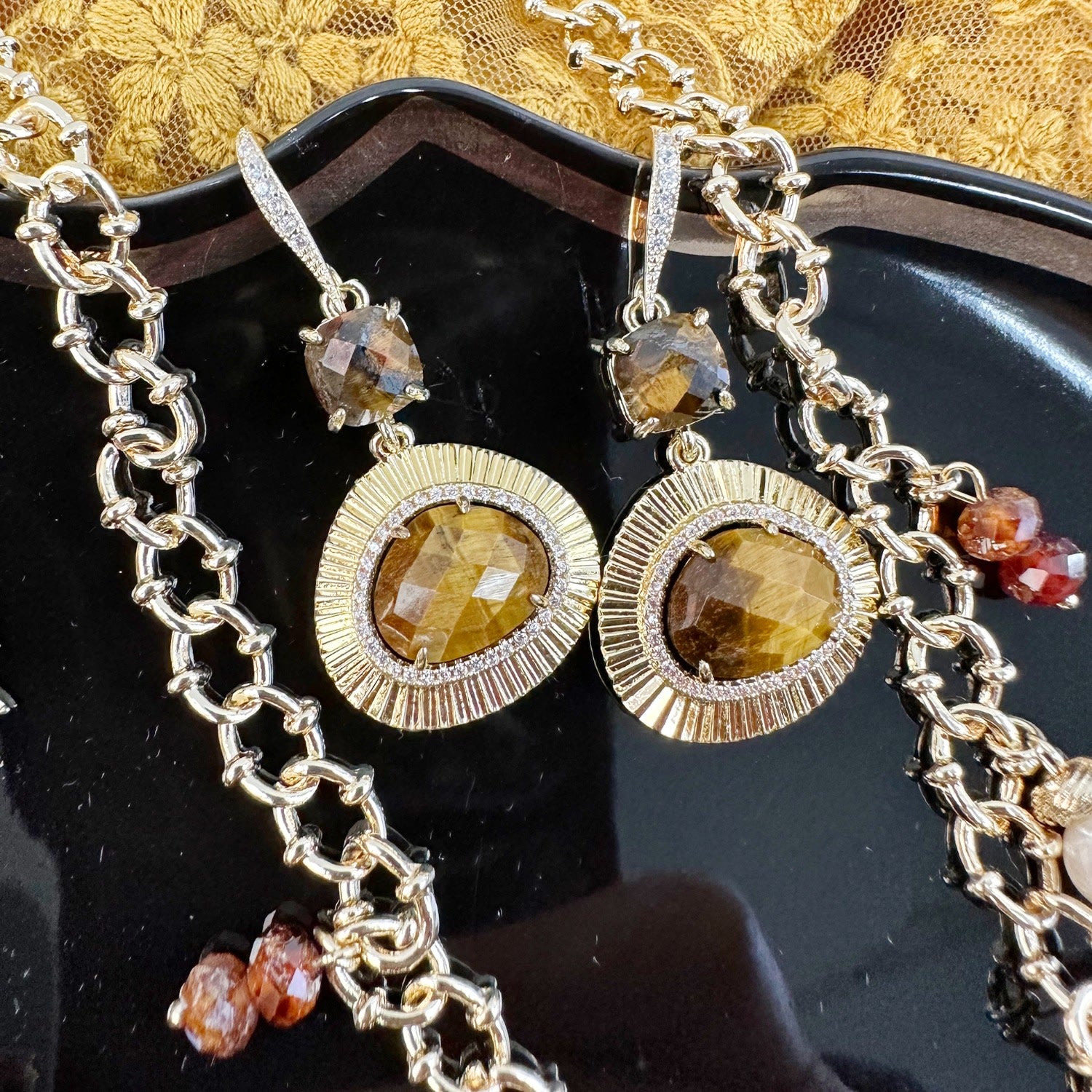 Teardrop Tiger Eye Setting Dangle Earrings