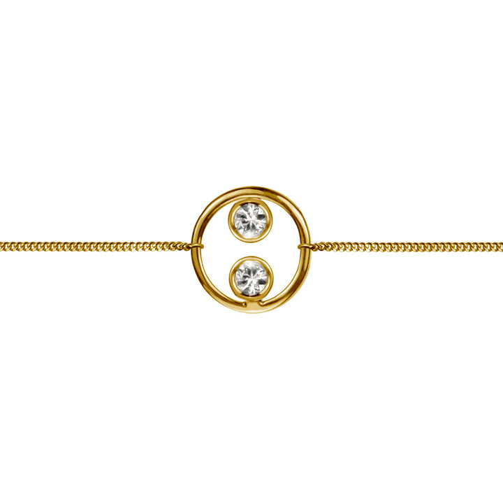 This delicate Halo bracelet is simple, elegant and great for everyday styling - a symbol of purity, togetherness and love. Bracelet features an 18ct Gold vermeil Halo circle, with two brilliant cut white sapphires that sit inside the halo, attached to a delicate chain.
