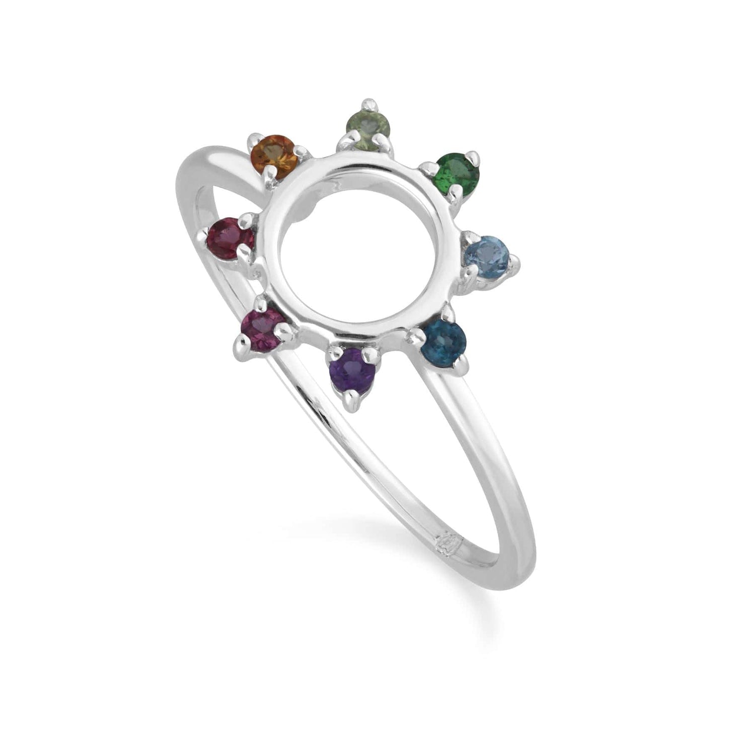 A playful rainbow ring bursting with expressive colour. Embellished with rhodolite, pink tourmaline, citrine, tsavorite, peridot, blue topaz and amethyst gemstones, this gold plated ring is a ray of sunshine in an open circle design and a spectrum of colours. Bring a pop of colour to your ring stack repertoire.