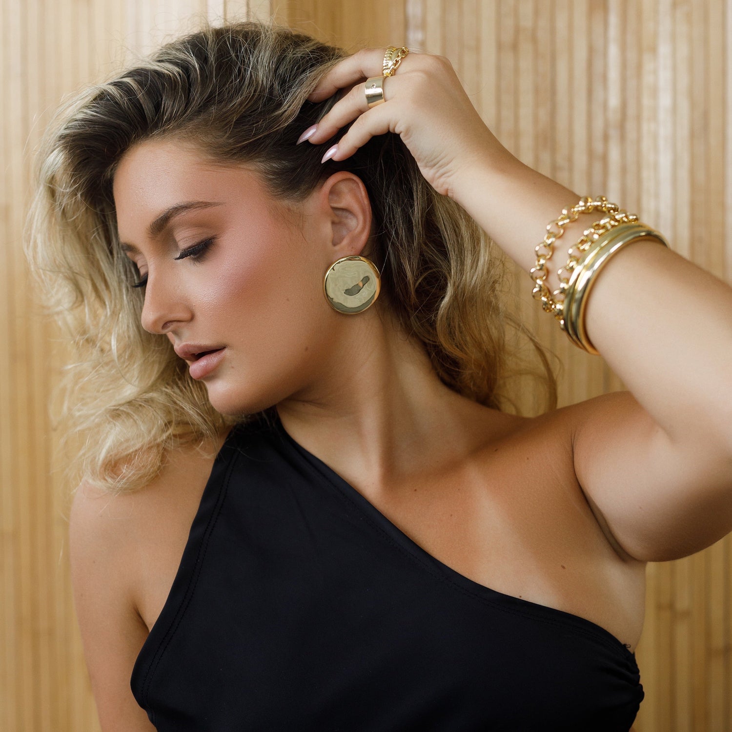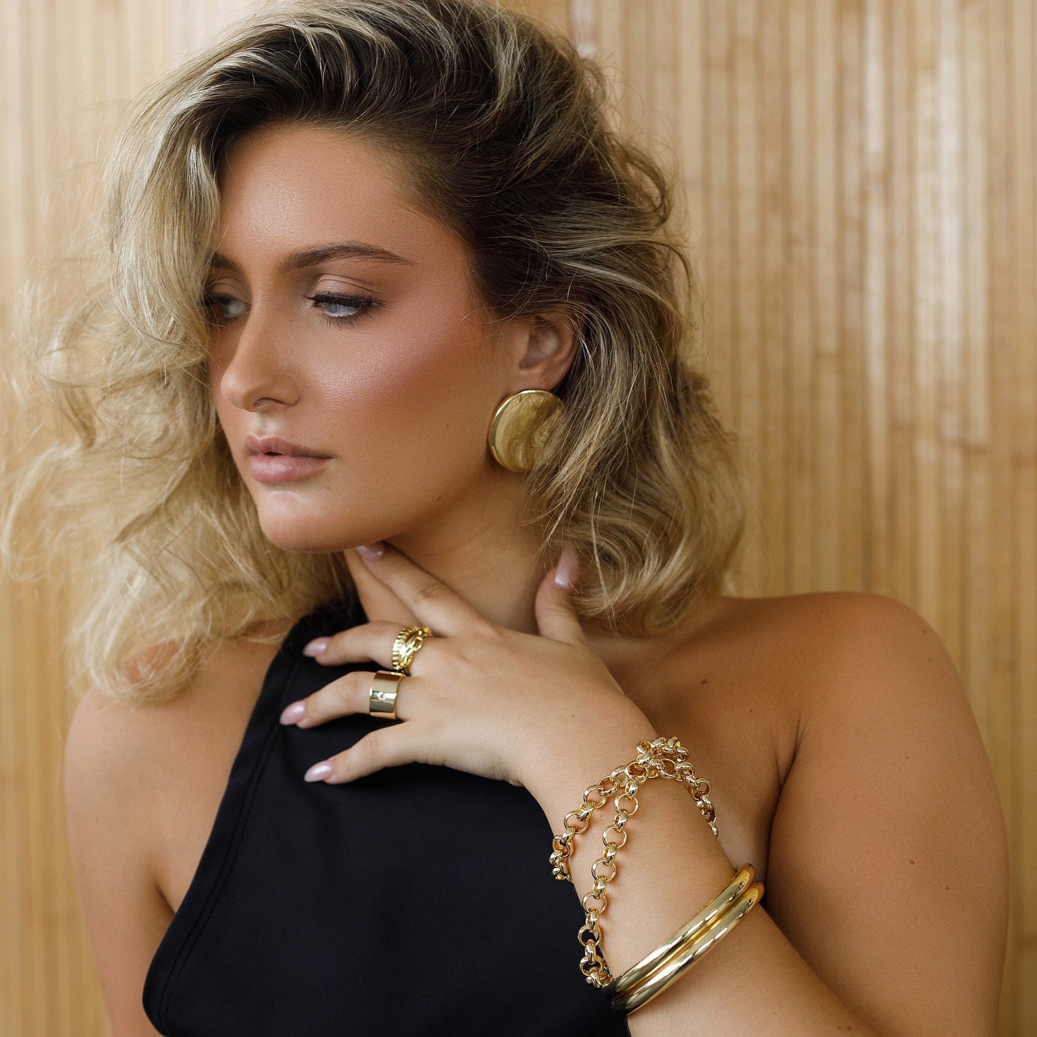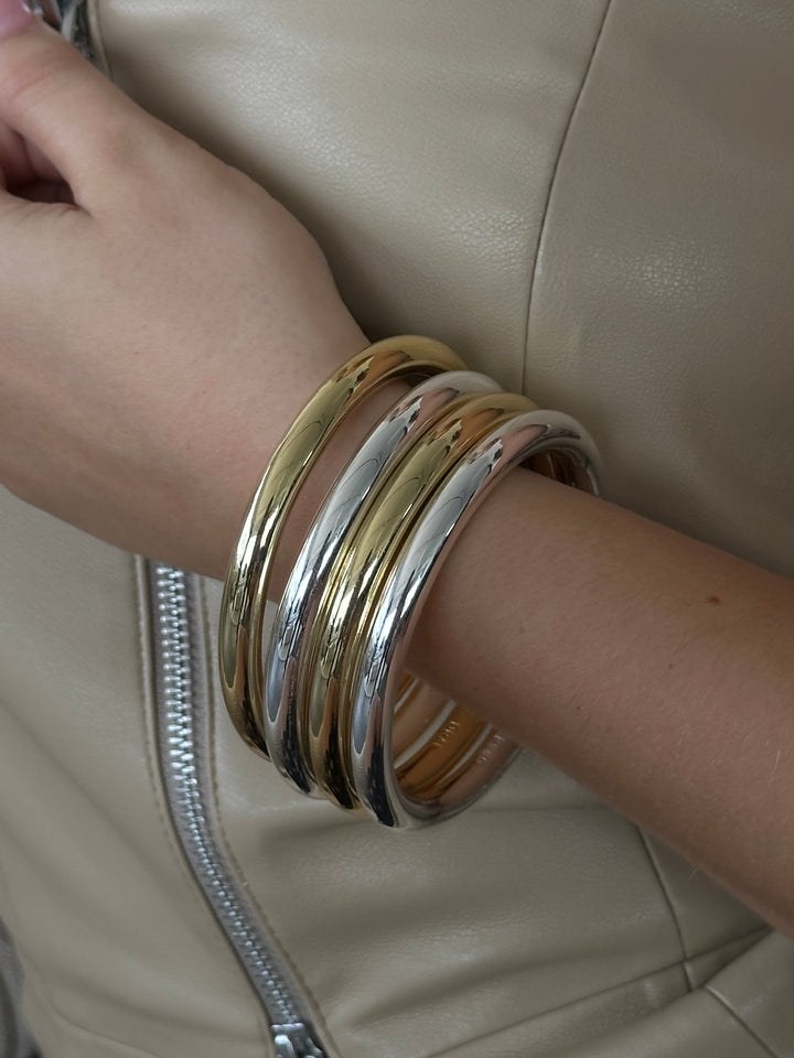 These Stackable Bangle Gold bracelets by Drae Collection are a simple yet elegant accessory. They are plated with a thick layer of solid 14k Gold on brass and have an e-coat for extra luster and durability. These bangles are long-lasting, water-resistant, and tarnish-resistant. Their simplicity and elegance make them a timeless design that can be stacked for a groovin' look.