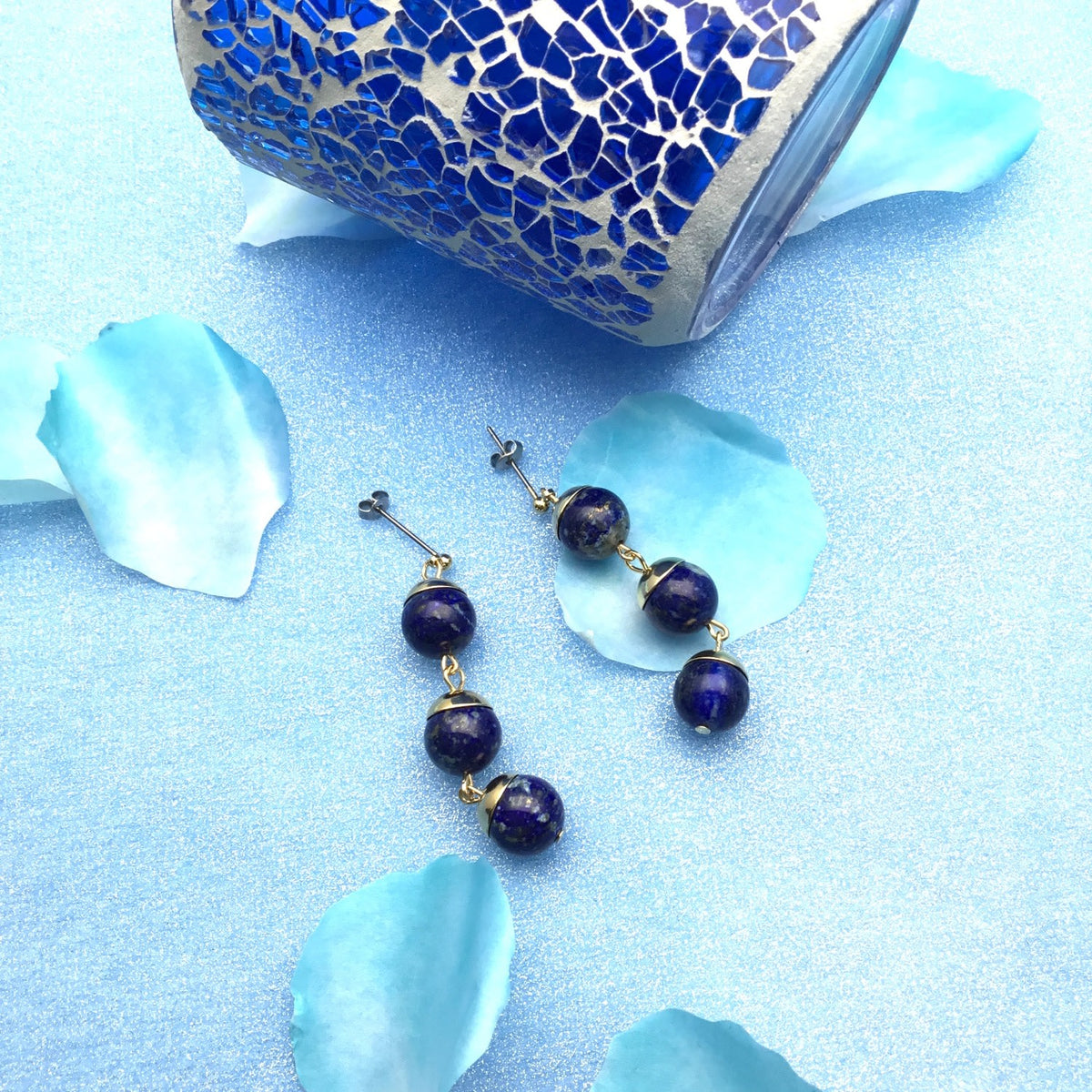 These dangle earrings are made of natural lapis lazuli balls with Japan golden-plated brass findings.