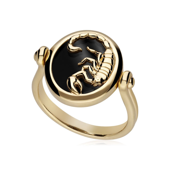 Express yourself with this gorgeous reversible zodiac signet ring crafted in 925 yellow gold plated silver with black onyx gemstone. On one side the word ‘Scorpio’ has been carefully inscribed and the reverse side of the ring depicts the scorpion of Scorpio symbol.