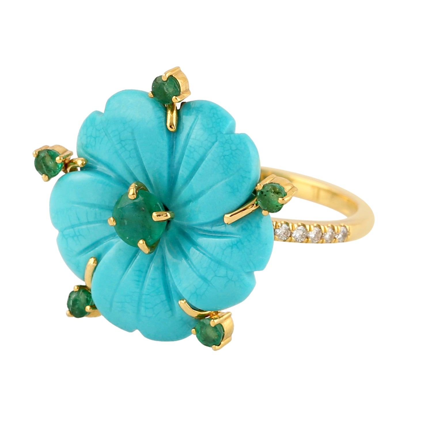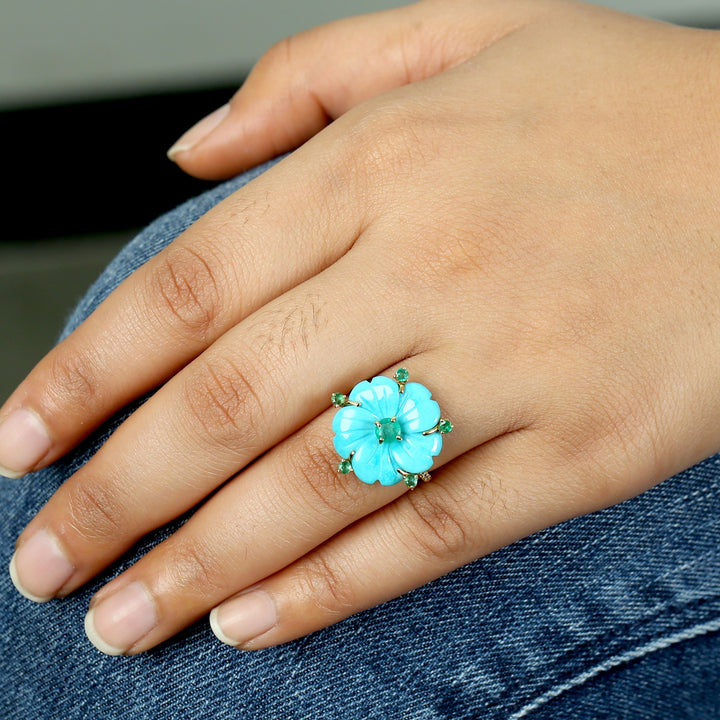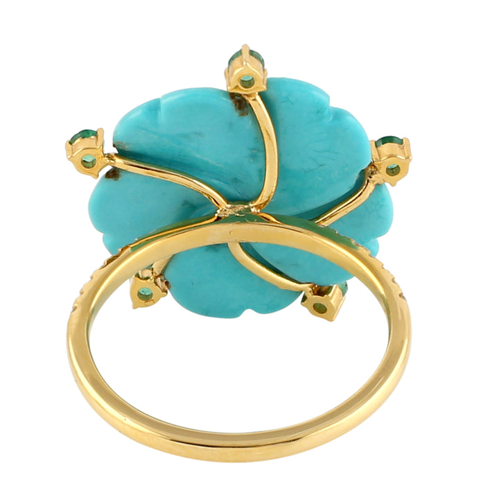 This Ring is handmade in 18k Yellow Gold and Diamond - 0.12 cts, Turquoise - 5.82 cts, Emerald - 0.62 cts