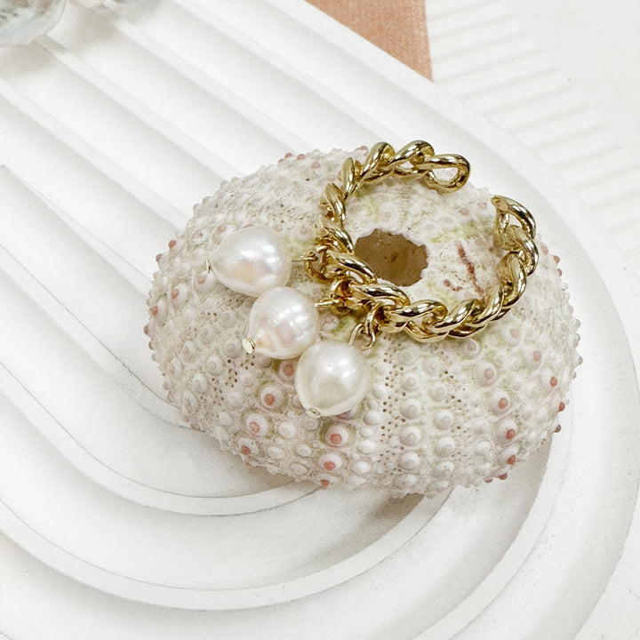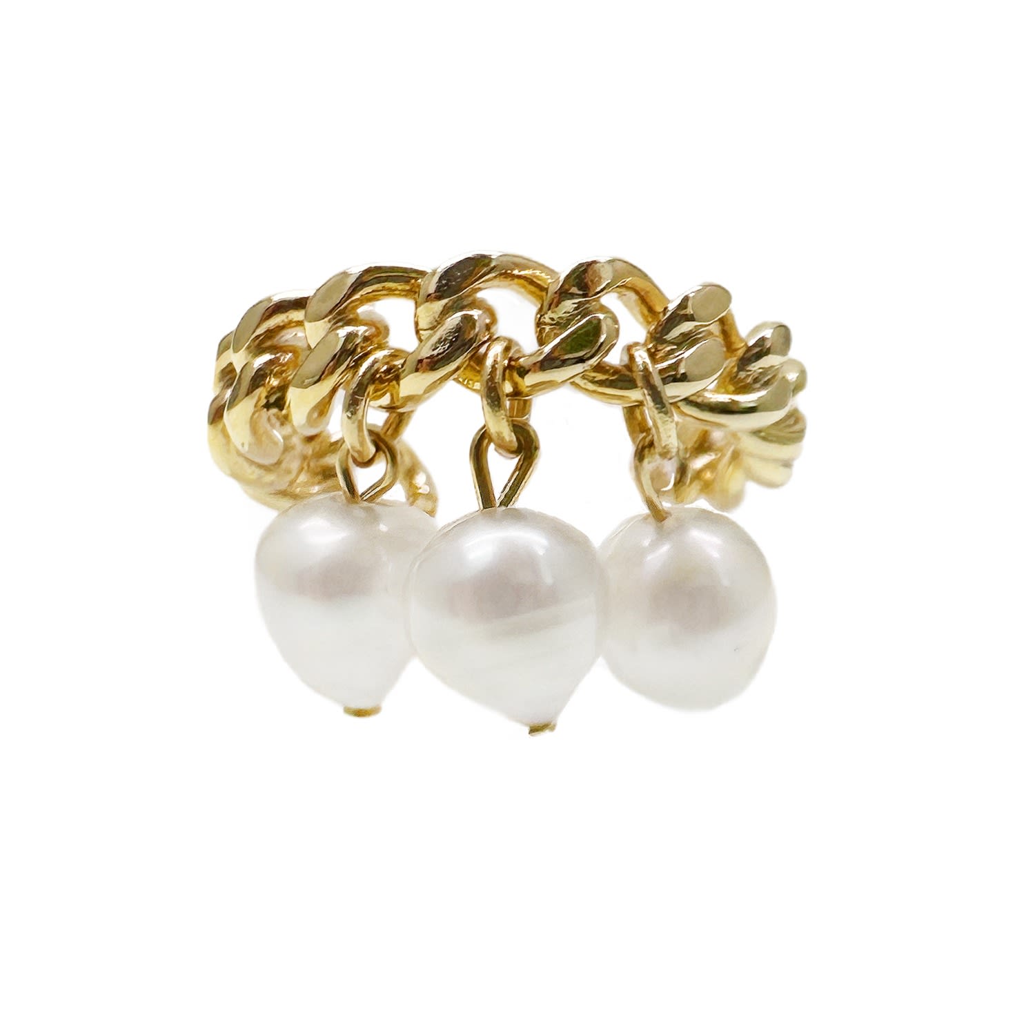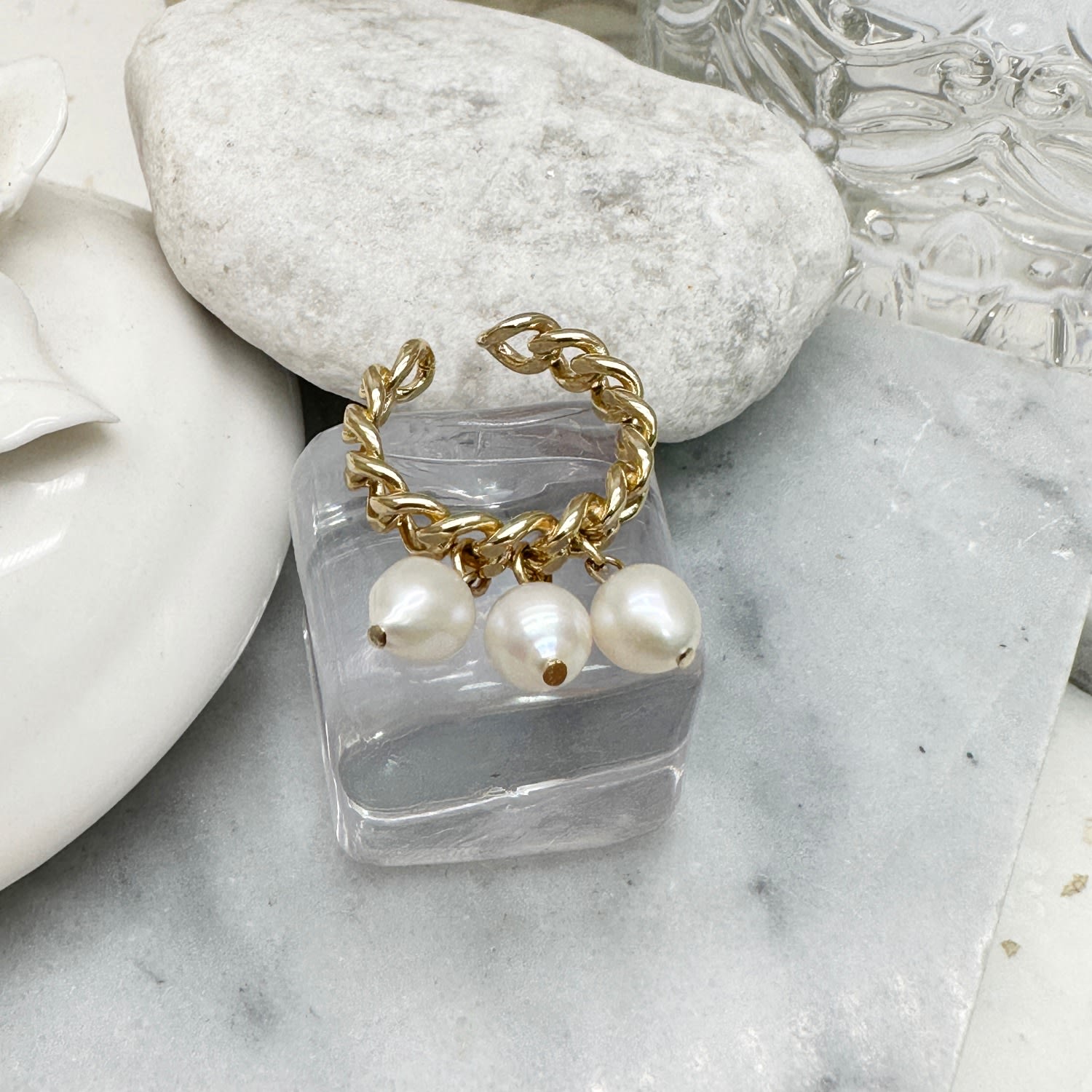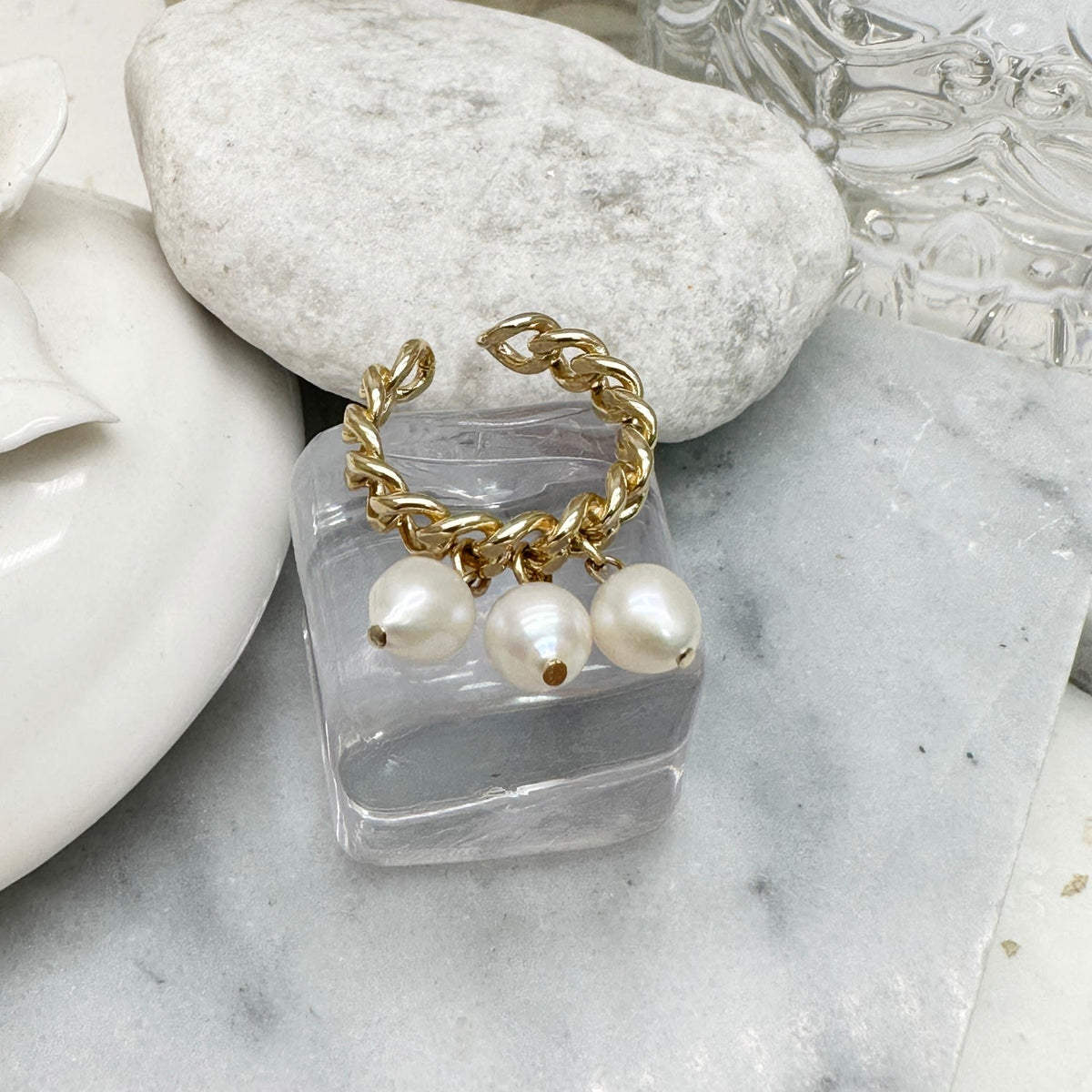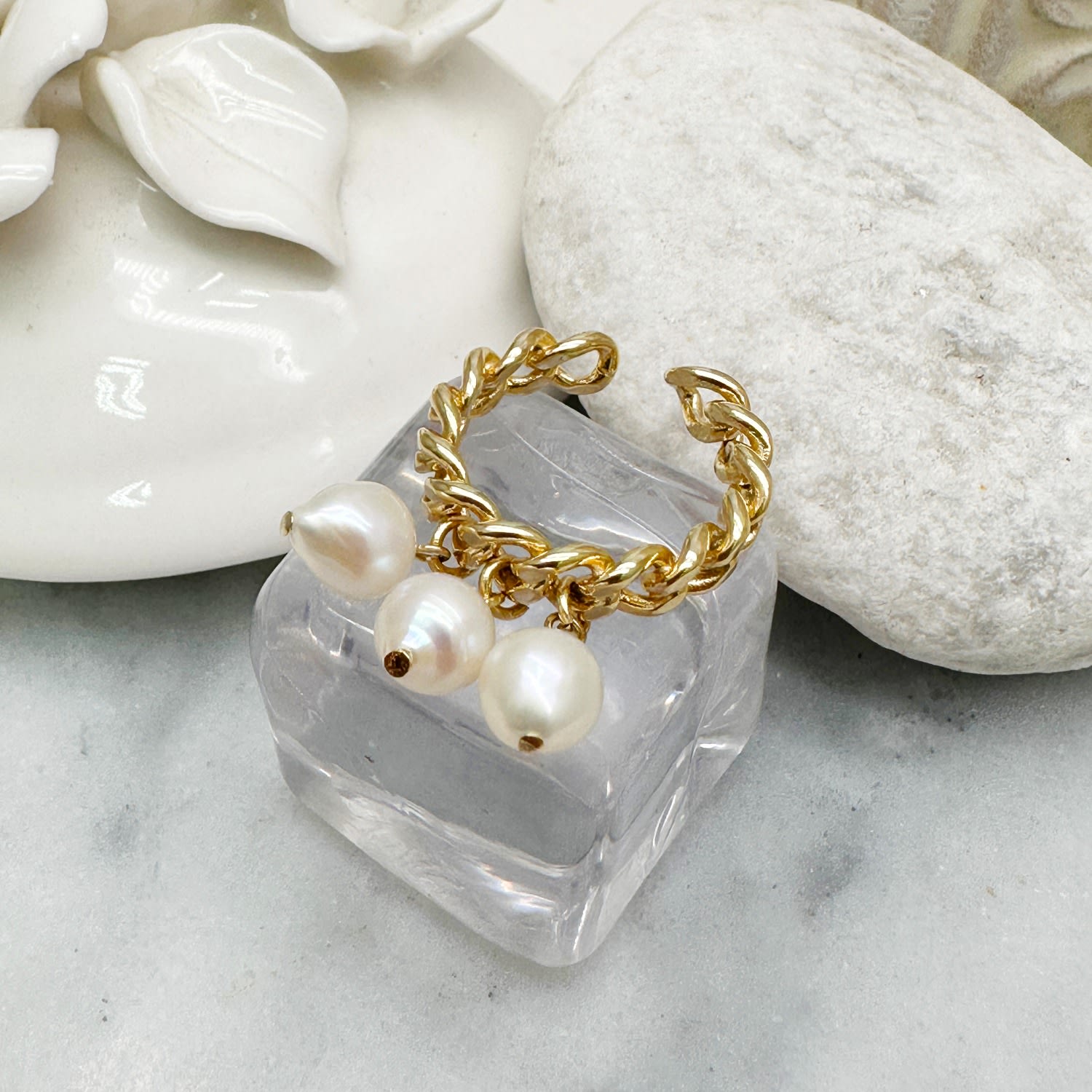 This adjustable ring is made from 14K gold-plated brass and features natural cultured freshwater pearls in a drop-shaped design.