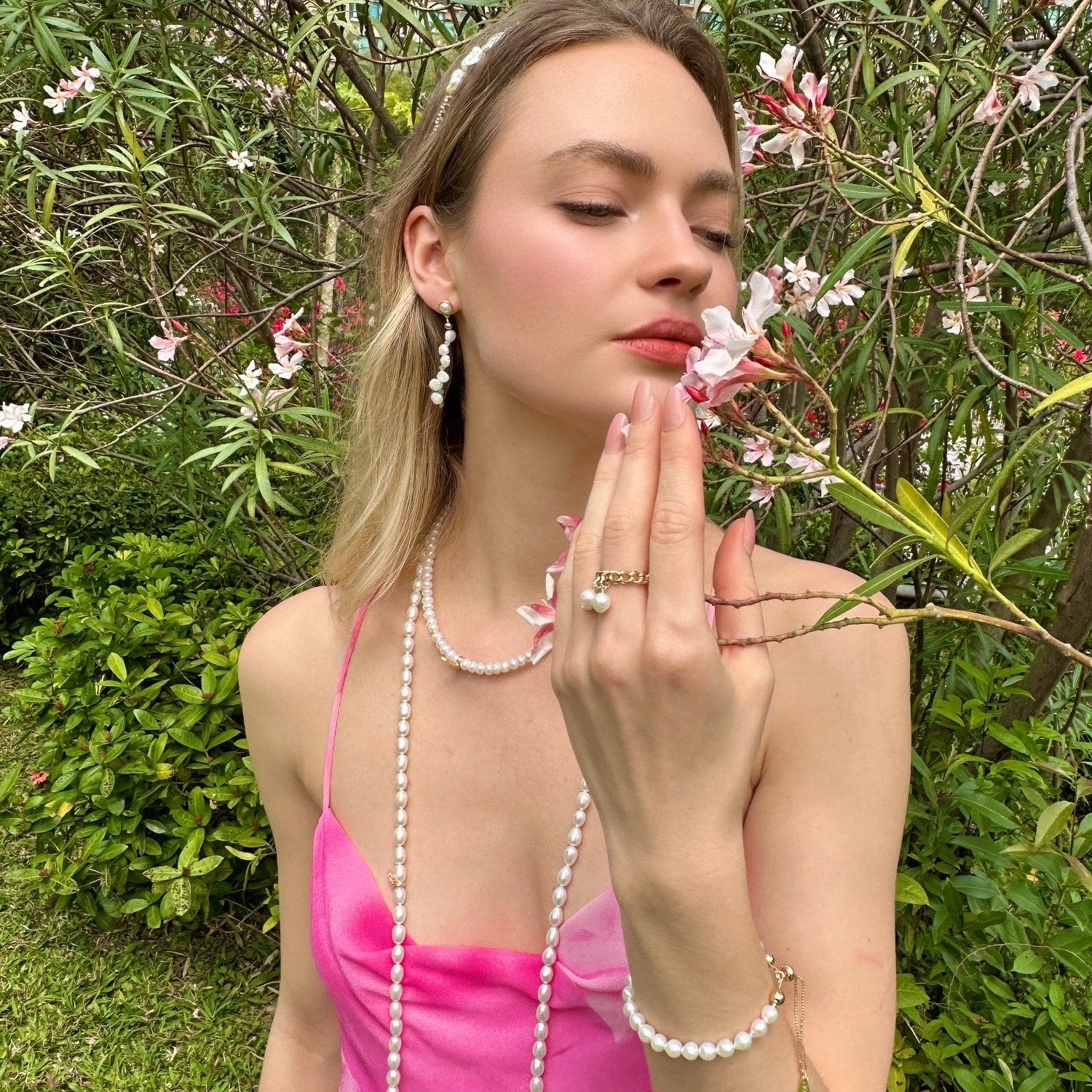 Freshwater Pearls Drops Adjustable Ring by Farra is an elegant and feminine piece. This adjustable ring features delicate freshwater pearls in a drop-shaped design, arranged on a 14K gold-plated brass band. The lustrous pearls, known for their natural radiance, create a stunning focal point. The adjustable feature ensures a comfortable fit, and the ring is associated with purity and grace, making it a sophisticated addition to any ensemble.