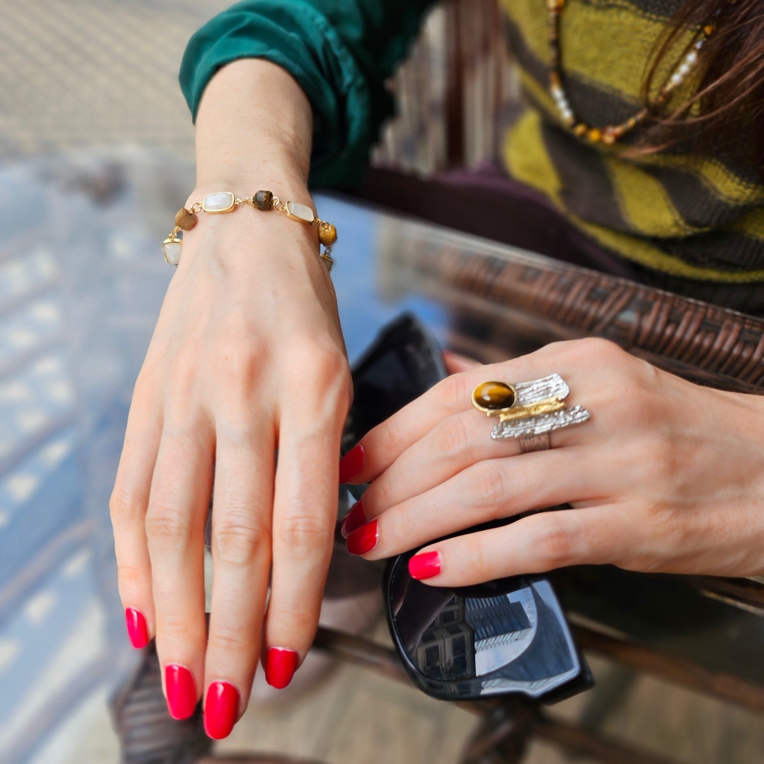 Natural tiger eye gemstone set in platinum-plated brass. Adjustable band.