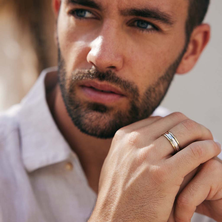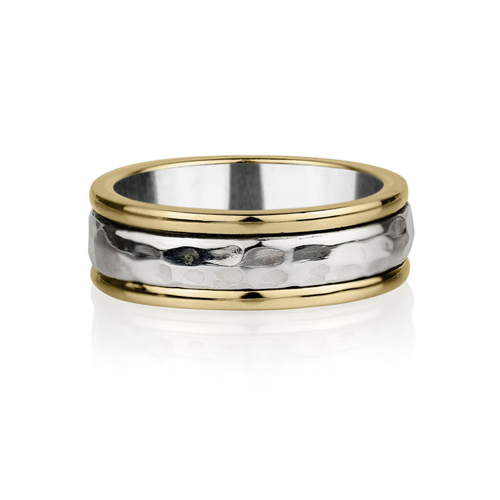 Handmade in sterling silver and brass. 7mm hammered spinning band design.