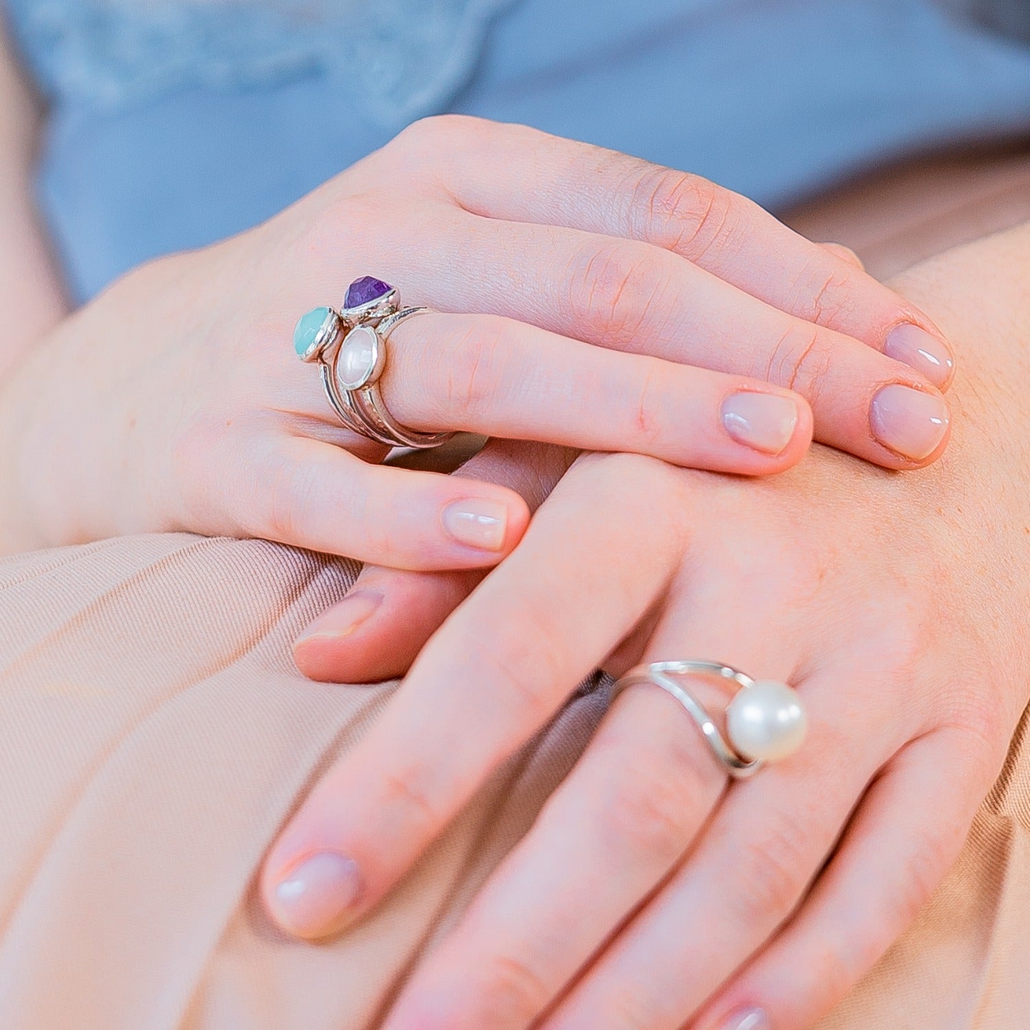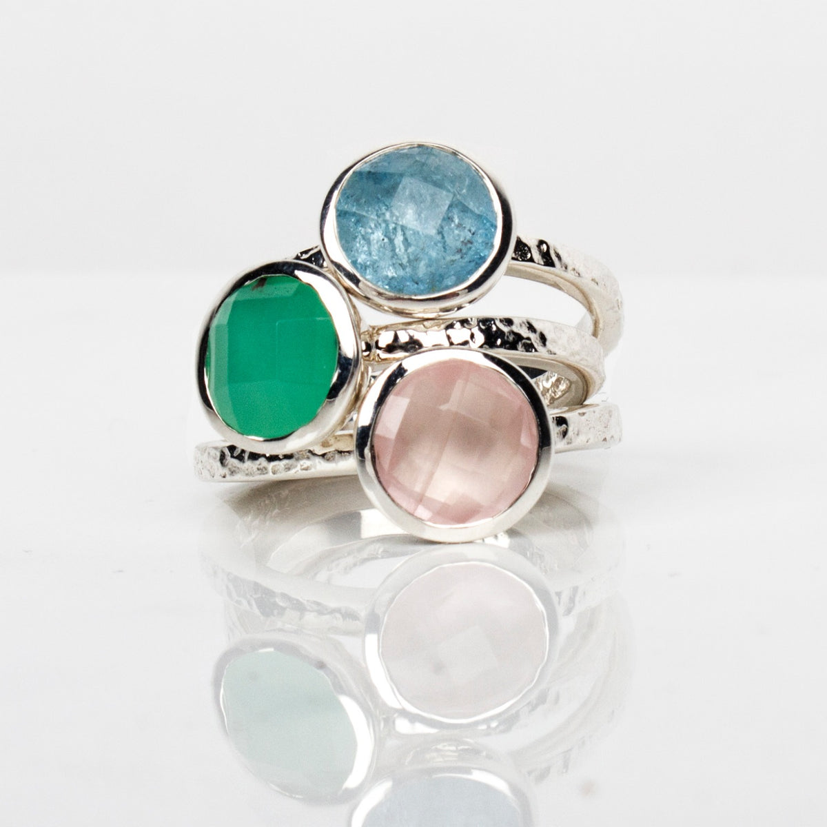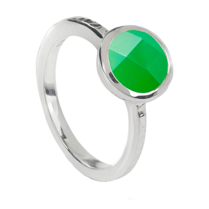 This stacking ring has a contemporary look and feel. The ring is made from Sterling Silver with a protective Rhodium plating to enhance and maintain the lustre of the silver. The stacking ring features a multifaceted Chrysoprase gemstone with a hammer-textured ring band. The ring is available in various gemstone options, which can be worn alone for a minimalist look or stacked with other Estella rings to create your own ring set. Our skilled jewellers handmade this ring according to strict sustainability and ethical guidelines. All our jewellery is certified by the Responsible Jewellery Council. We only work with natural precious gemstones and precious metals. Each piece is unique and no two pieces are identical. Sterling silver with a natural semi-precious gemstone