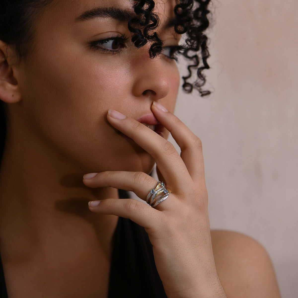 This lovely ring is named after the Clatto Reservoir in Dundee, supposedly Scotland's sunniest city. If there was any Scottish body of water destined to sparkle in the sun as this ring does, it's this one! Different strands sweep into each other and cross over like waves meeting on a lake. With beautifully textured mixed metal and sparkling blue topaz, this ring is sure to light up your look.