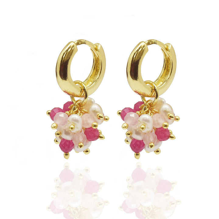 These hoop earrings are crafted from 18k gold-plated metal and feature pink jade, rose quartz, and freshwater pearls.