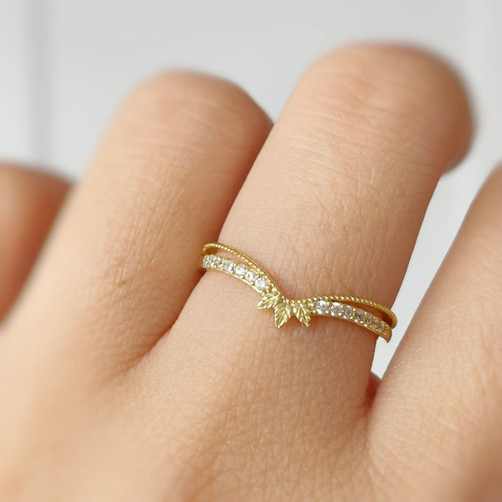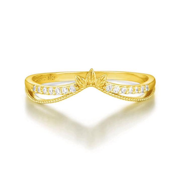 Embrace the versatility of the Abloom B Stacking Band, as it perfectly complements your personal style. Its intricate leaf design and sparkling white topaz gems evoke a sense of grace and elegance, while the split shank band adds a modern twist. Whether you choose to stack it with other rings or let it shine on its own, this exquisite piece is sure to make a statement.