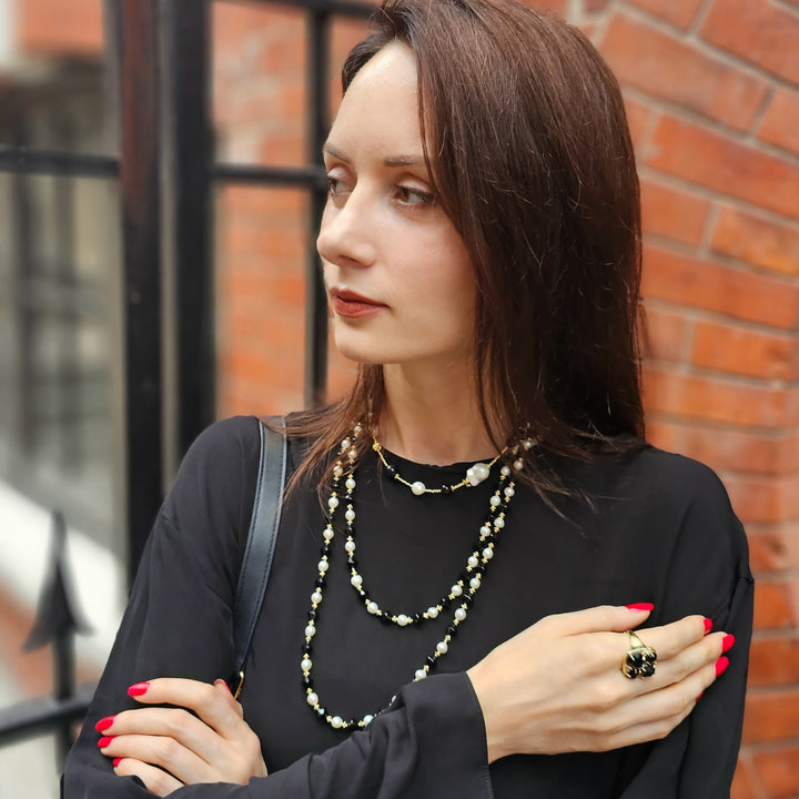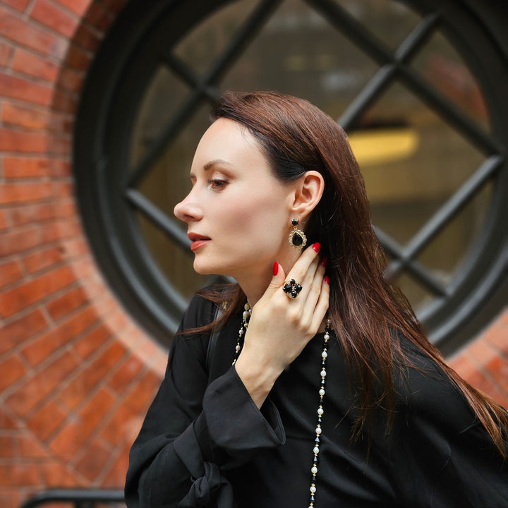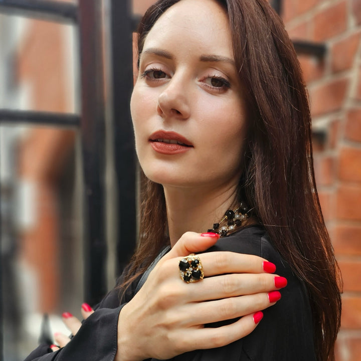 This Black Agate with Zircon Statement Adjustable Ring by Farra makes a bold impression while carrying symbolic strength. The grounding black agate stone contrasts with sparkling zircon accents, creating a balance of power and brilliance. Designed with an adjustable band, it is versatile, elegant, and a reminder to remain centered in style and spirit.