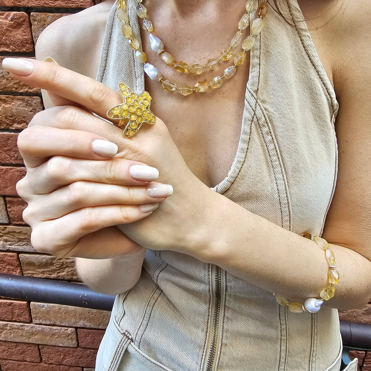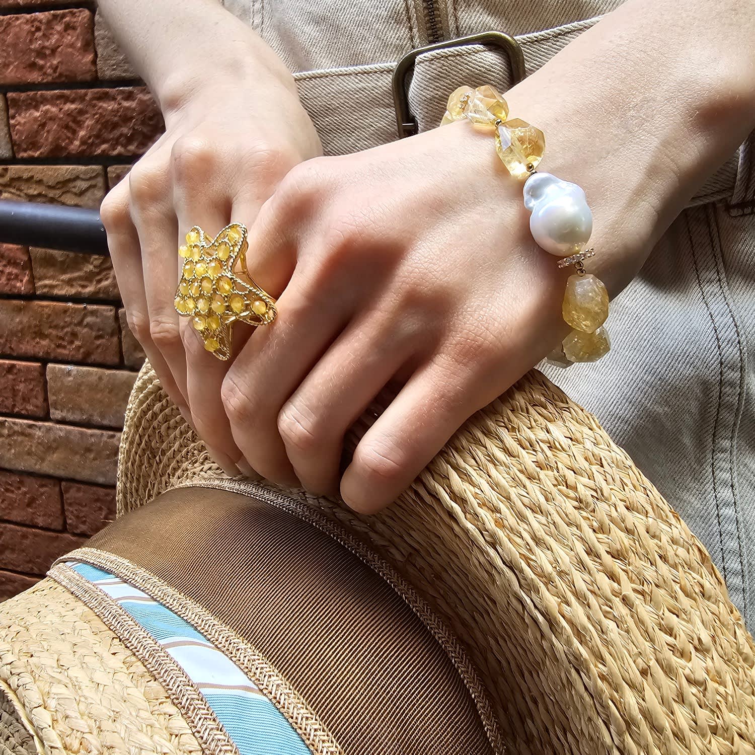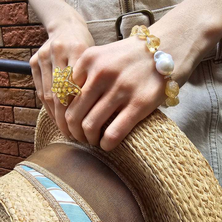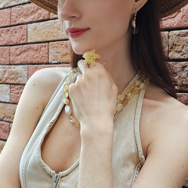 This statement ring is set with yellow agate stones and has a star-shaped design. The base metal is not specified.