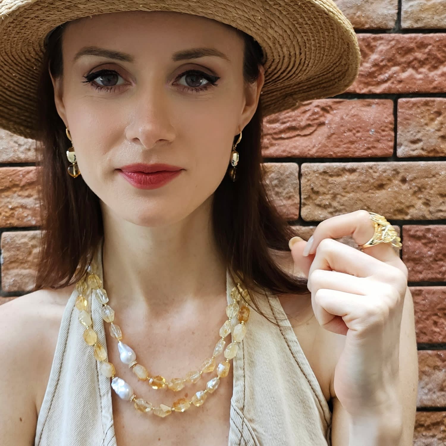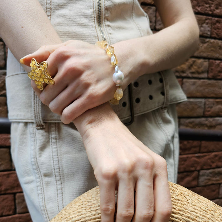 The Yellow Agate Star Setting Statement Ring by Farra is a playful and vibrant accessory. This stunning ring features a star-shaped design with cheerful yellow agate stones, known for their bright hues and positive energy. The intricate setting and golden tones make this a standout piece for any occasion, capturing the essence of sunny days.