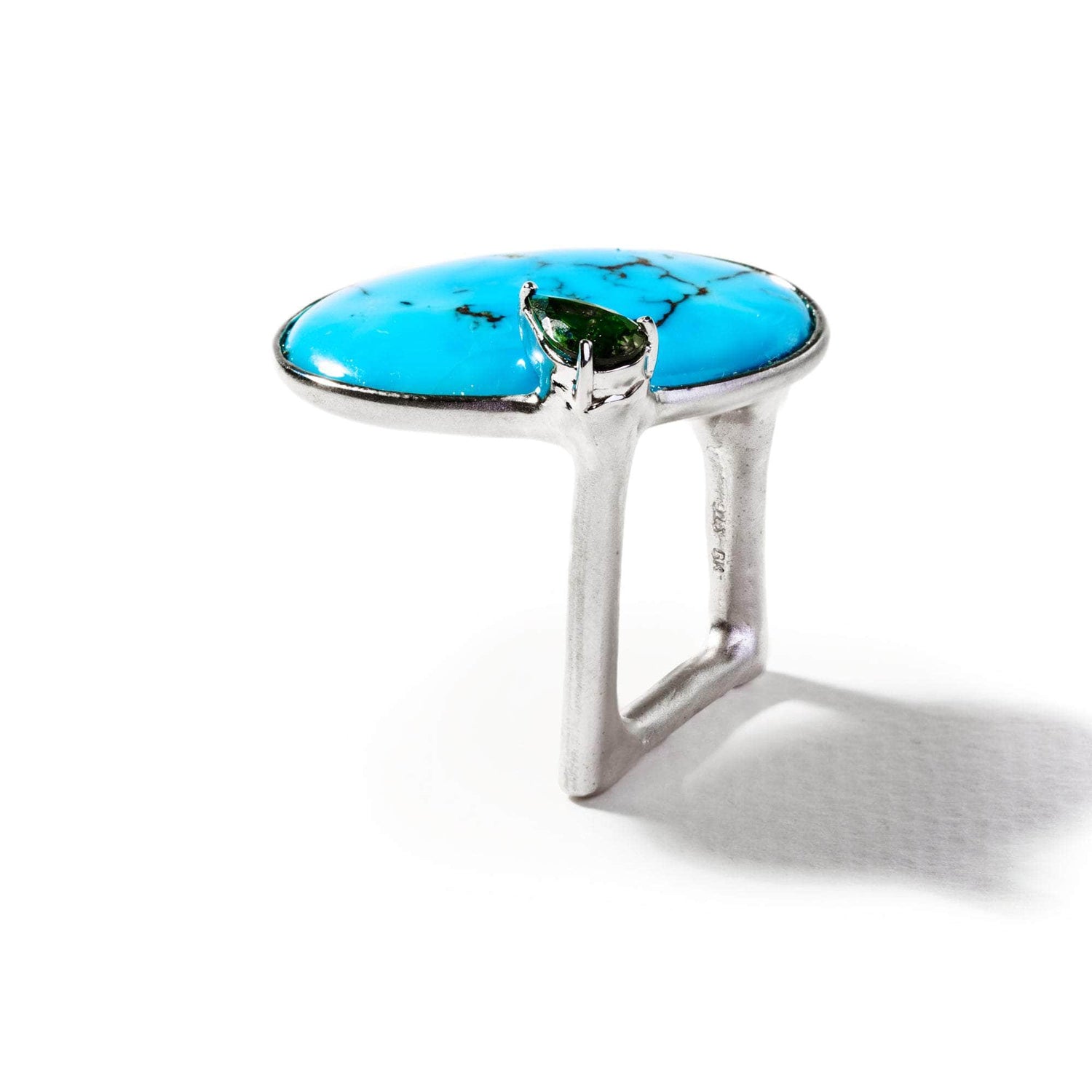 This ring, designed by the anarchist jewelry designer German Kabirski, exudes simplicity and organic beauty. Crafted as a singular piece from pure 925 silver, this contemporary masterpiece showcases a natural oval cabochon turquoise gemstone, while a small dot of dark olive tourmaline graces the side. The unusual square shape of the band gives the ring a distinct sculptural look that sets it apart from the ordinary.