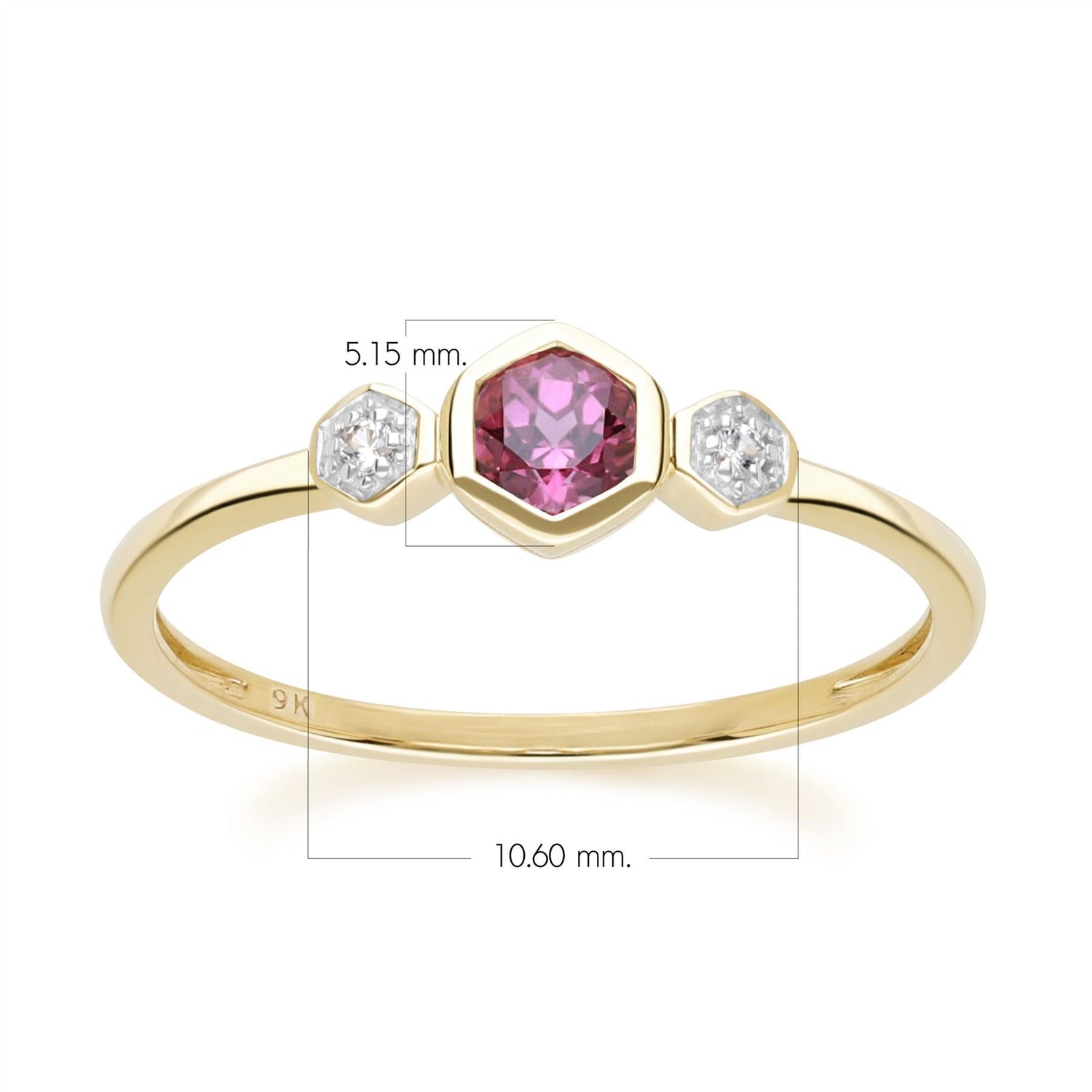 This Beautiful Geometric Round Rhodolite and Sapphire Ring in 9ct Yellow Gold. Rhodolite is a garnet gemstone with great romantic appeal, varying from rose-pink to red tones. Garnet is the birthstone of January and is a traditional gift for a 2nd wedding anniversary. Sapphire is famed for its beauty but also practical properties of strength and resiliance. Helen of Troy, famed for her lure and charm, was said to have owned a large star sapphire that symbolised her attraction. As a birthstone, sapphires represent September birthdays.