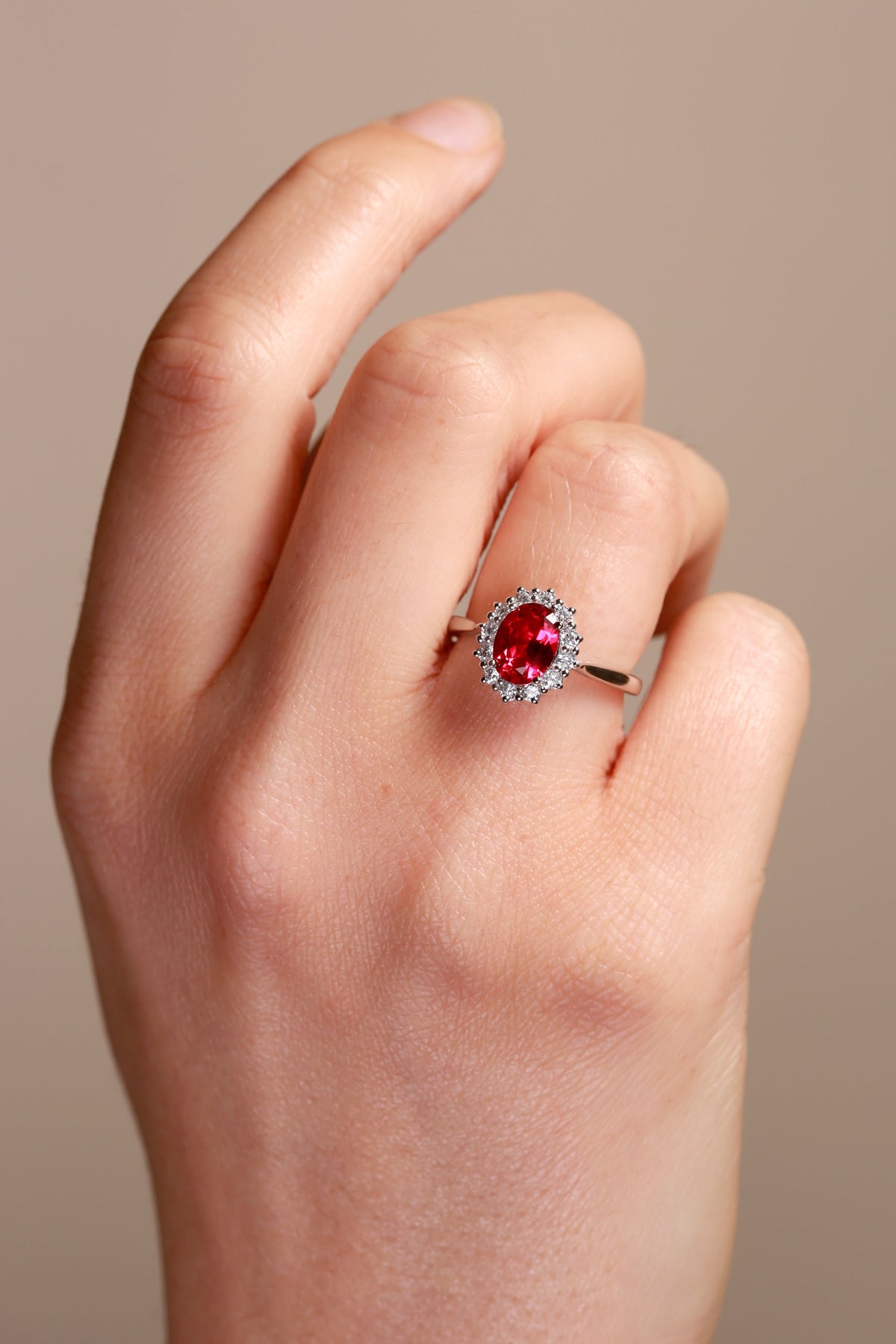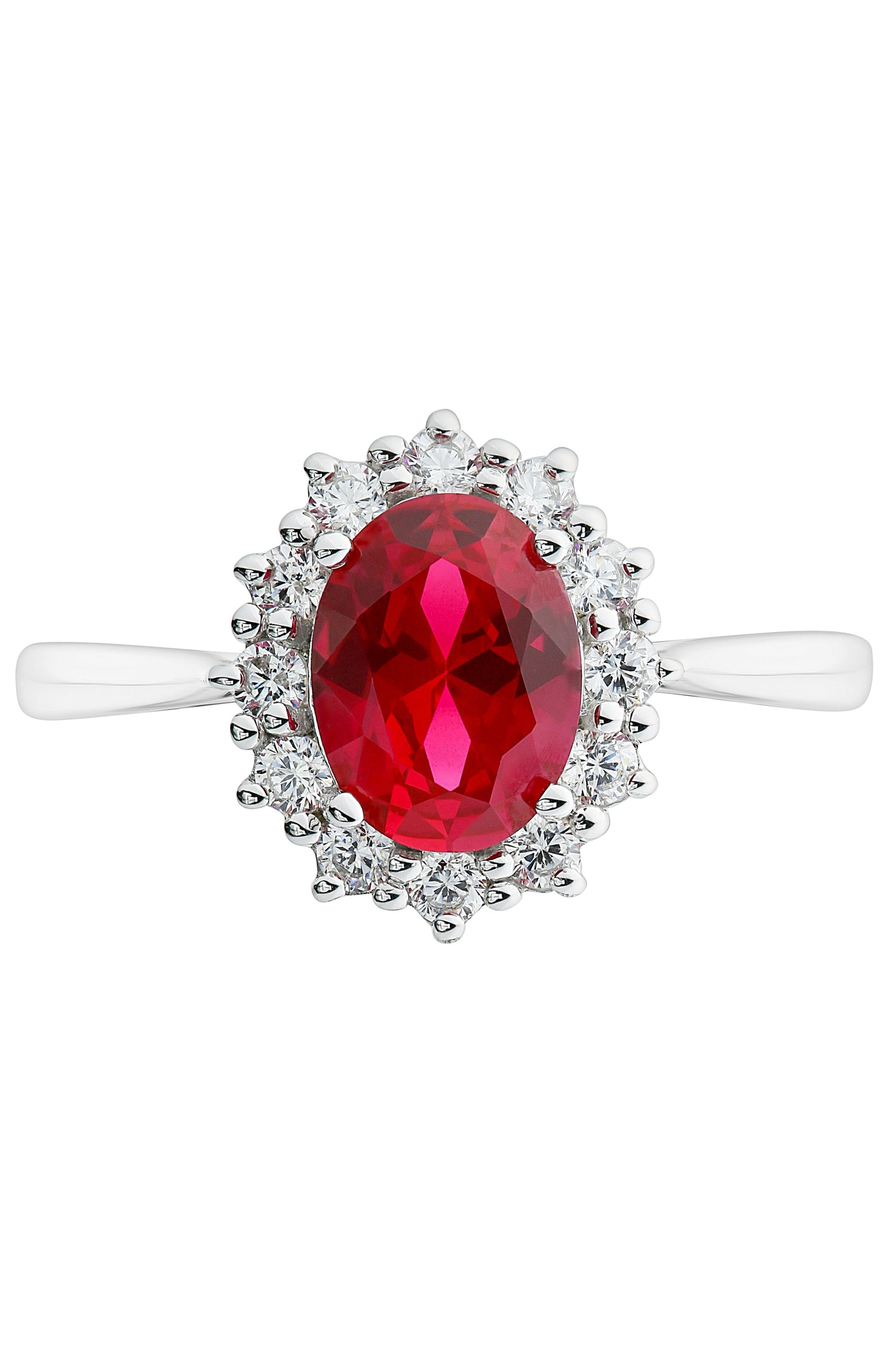 Our Cate ring is set with a rich red created ruby centre stone framed by a cluster of lab grown diamonds. Beautifully crafted in 9 carat white gold, the lab grown diamonds have a total weight of 0.25ct.