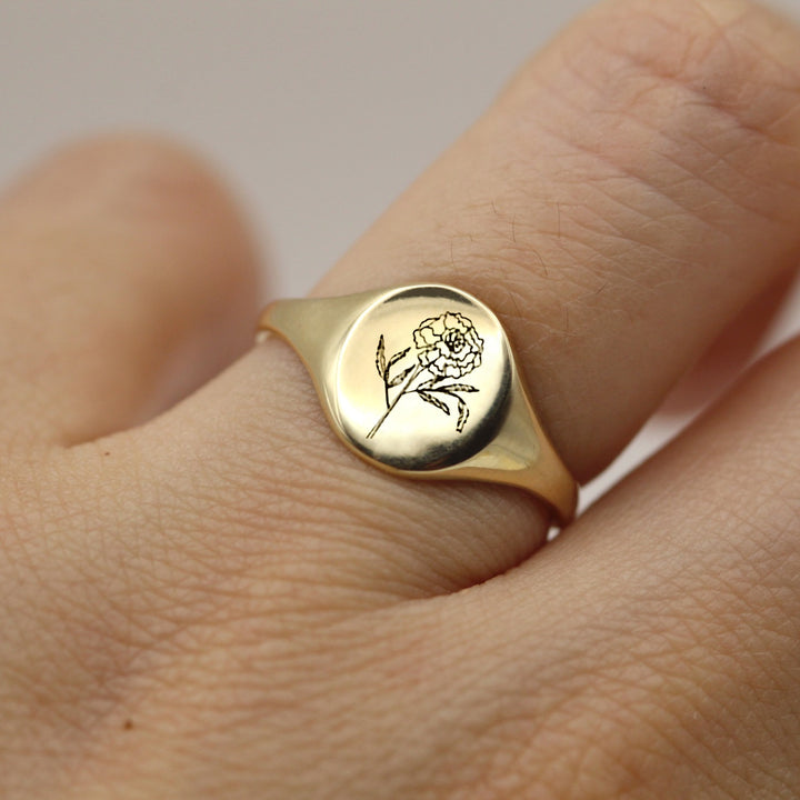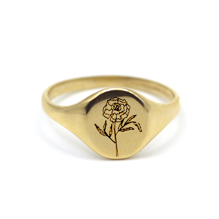 The marigold flower is a symbol of good luck and is thought to bring good fortune. The yellow color of the flower symbolizes wealth and success, and the solid gold ring is a sign of long-lasting love and commitment. High Polished Finish.