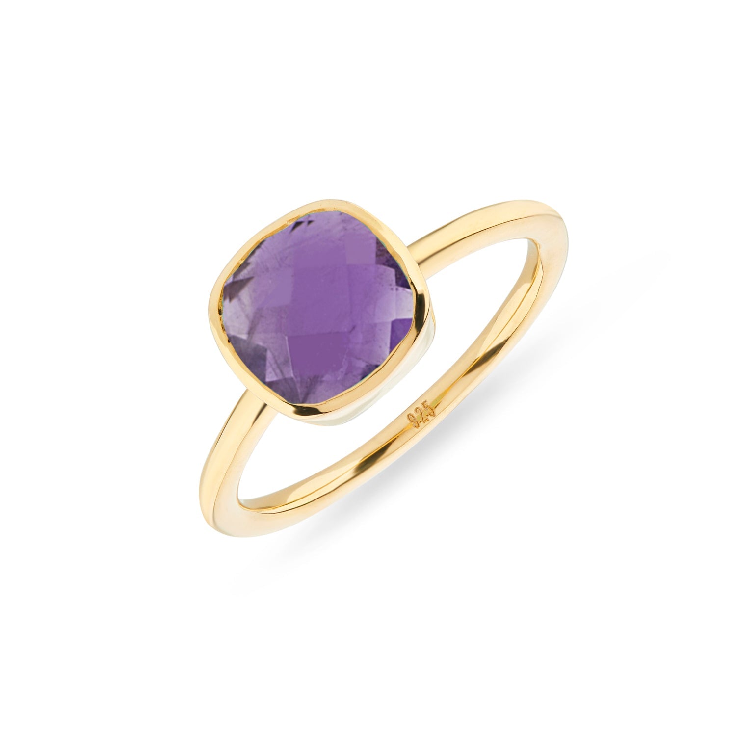 A cushion cut Purple Amethyst gemstone set on a polished 18ct Yellow Gold Vermeil band. The cut of the stone really makes the colour pop in this Amethyst ring, really does look good enough to eat!" - Amelia, Auree Founder.