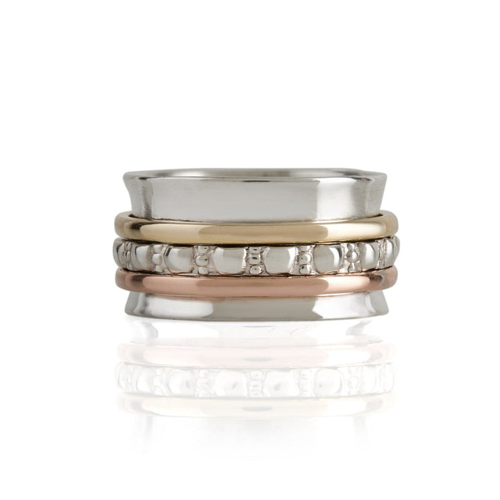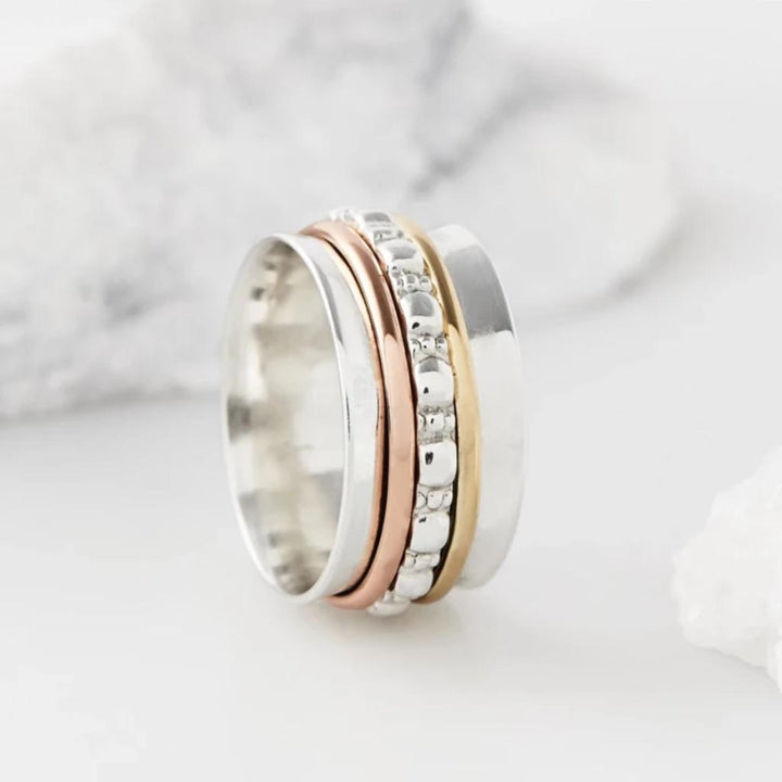 This ring is handmade with recycled sterling silver, brass, and copper. Its spinning design is meant to help soothe stress.