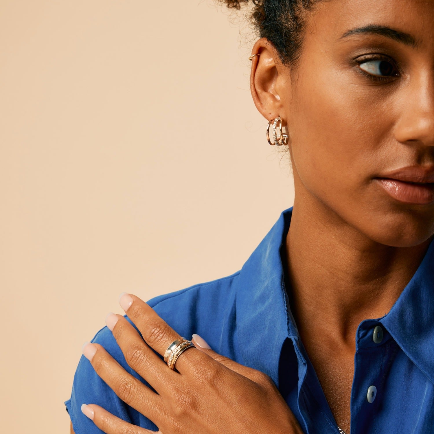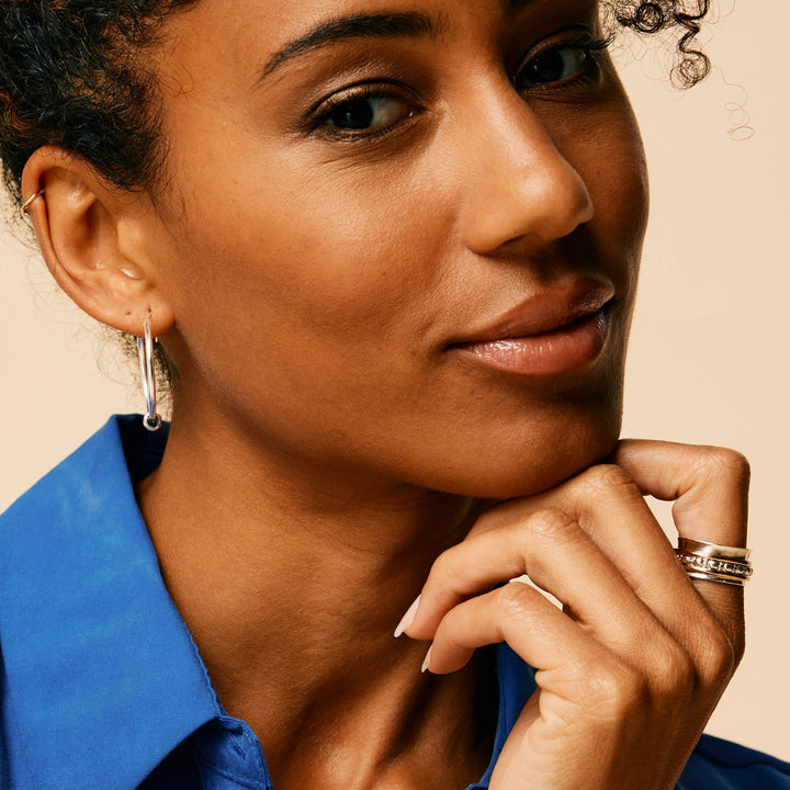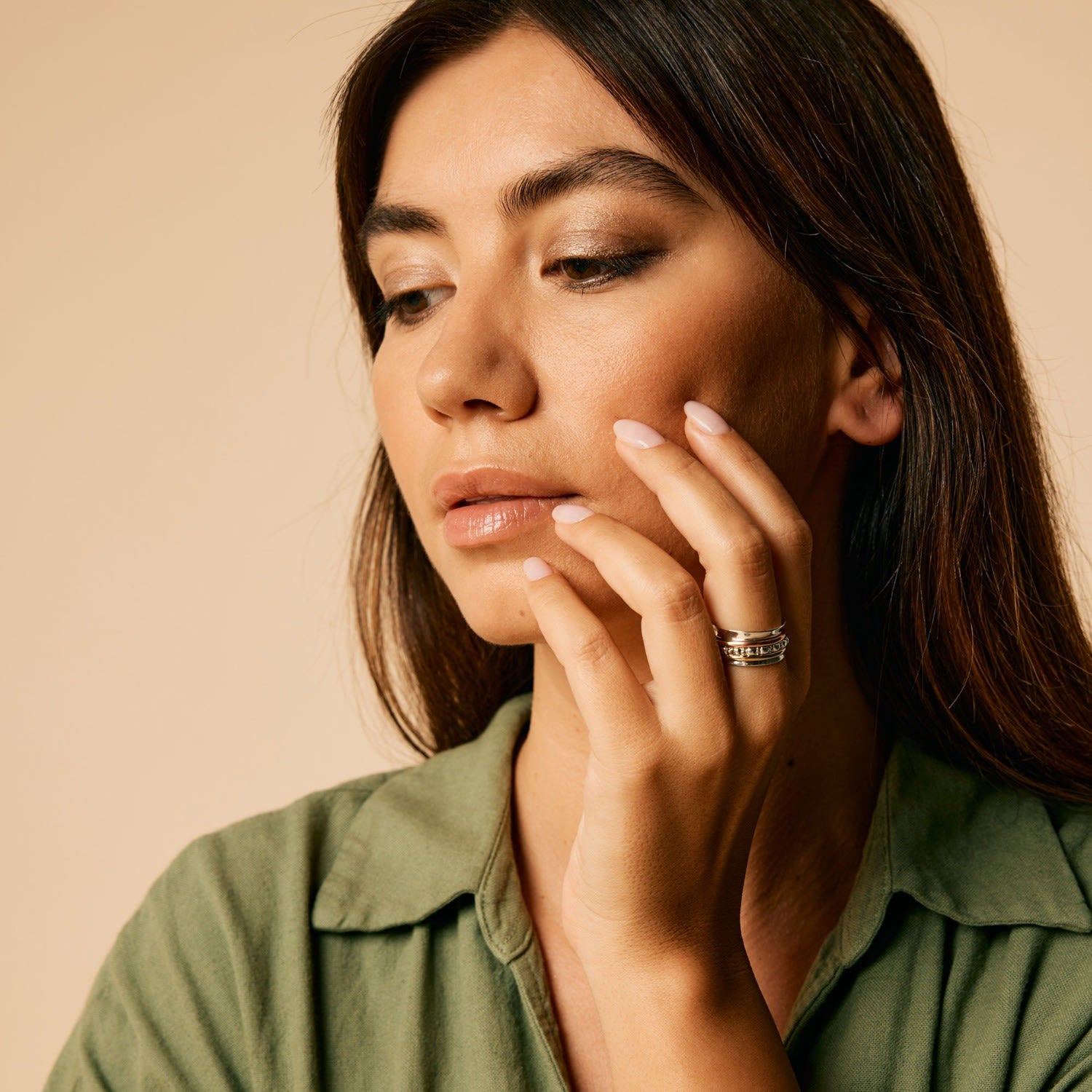 This Maharani Spin And Wish Silver Spinning Ring by Charlotte's Web Jewellery is a timeless piece of ethical jewelry designed to soothe the mind. Inspired by ancient meditation techniques, this stacked spinning ring can be spun to relieve stress. Crafted from recycled silver, brass, and copper, it's an eco-conscious accessory that combines style with a sense of calm. The ring is perfect for the free-spirited individual who wants a beautiful and meaningful piece that's made to last.