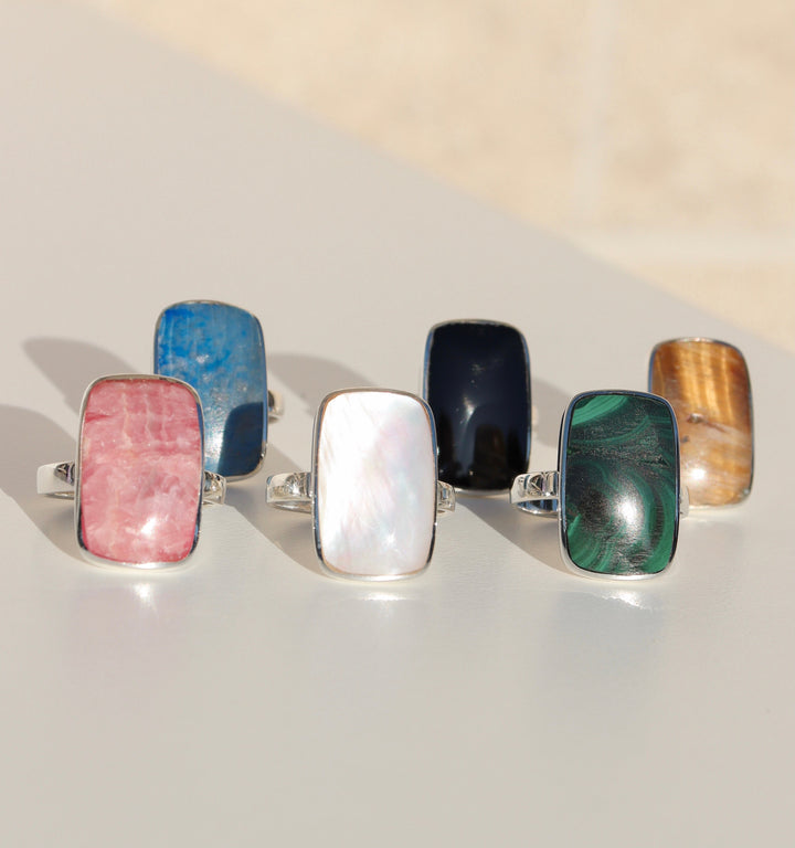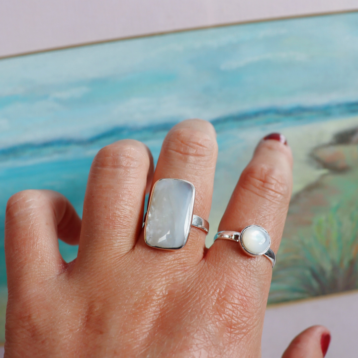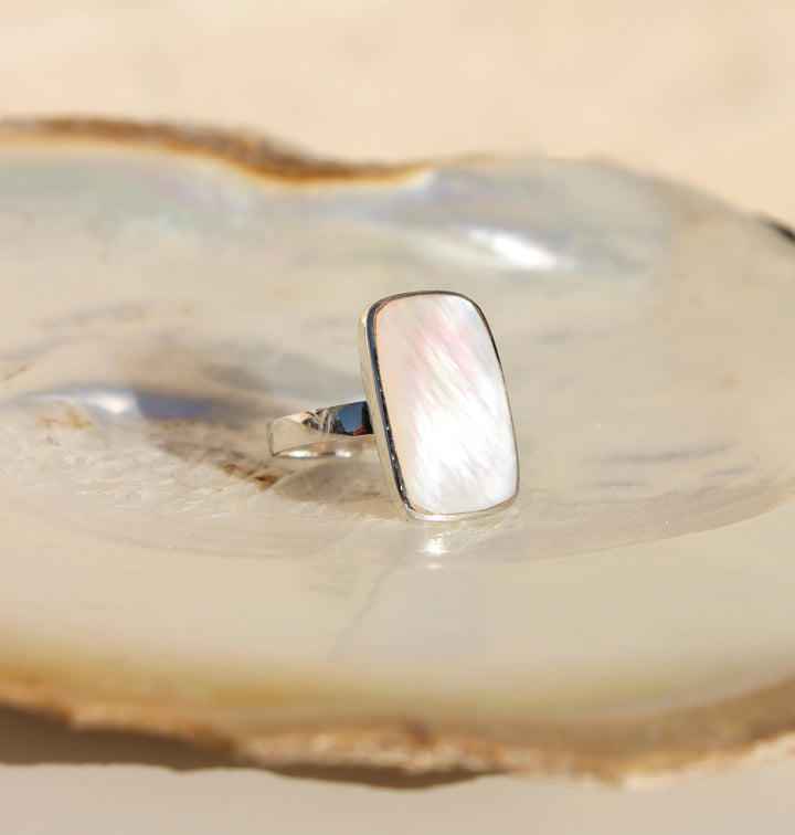 The timeless mother of pearl is the focus of this bold & beautiful ring. A rectangle cut of the mother of pearl sits in a sterling silver case and band. The shiny lustre of the mother of pearl is simply stunning. A perfect ring to wear year round.