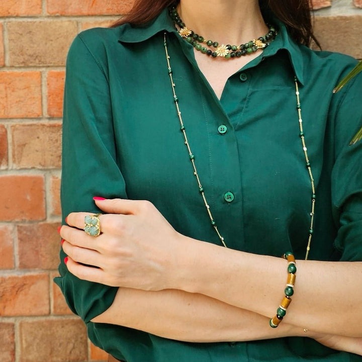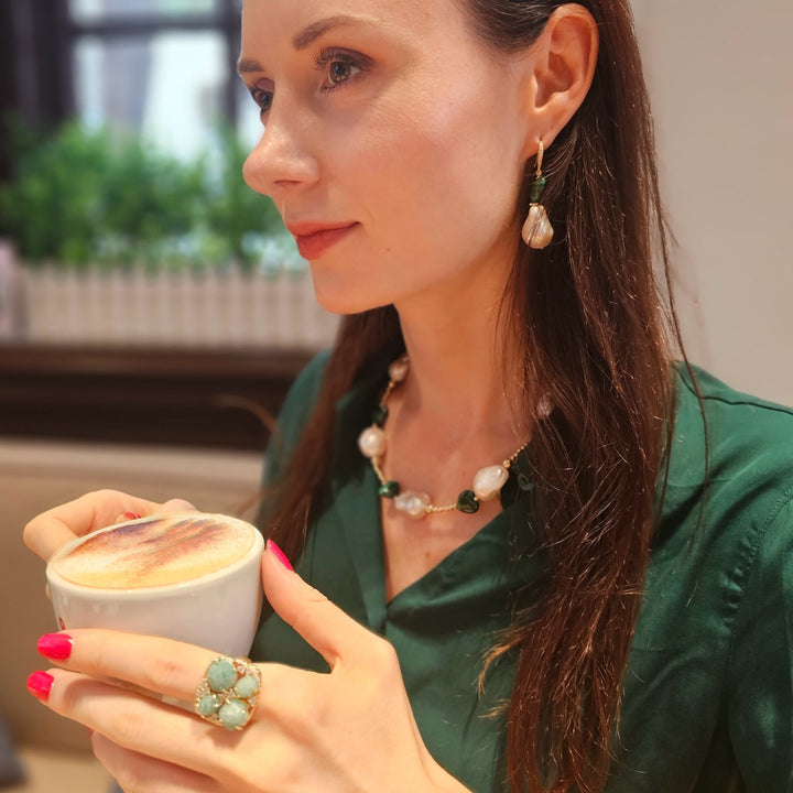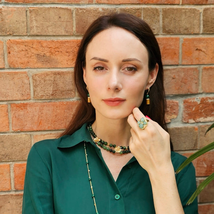 This Amazonite Setting Statement Ring by Farra celebrates the soothing hues of amazonite, set in a bold yet refined silhouette. Known as the stone of tranquility and balance, amazonite infuses this ring with both natural energy and timeless elegance.