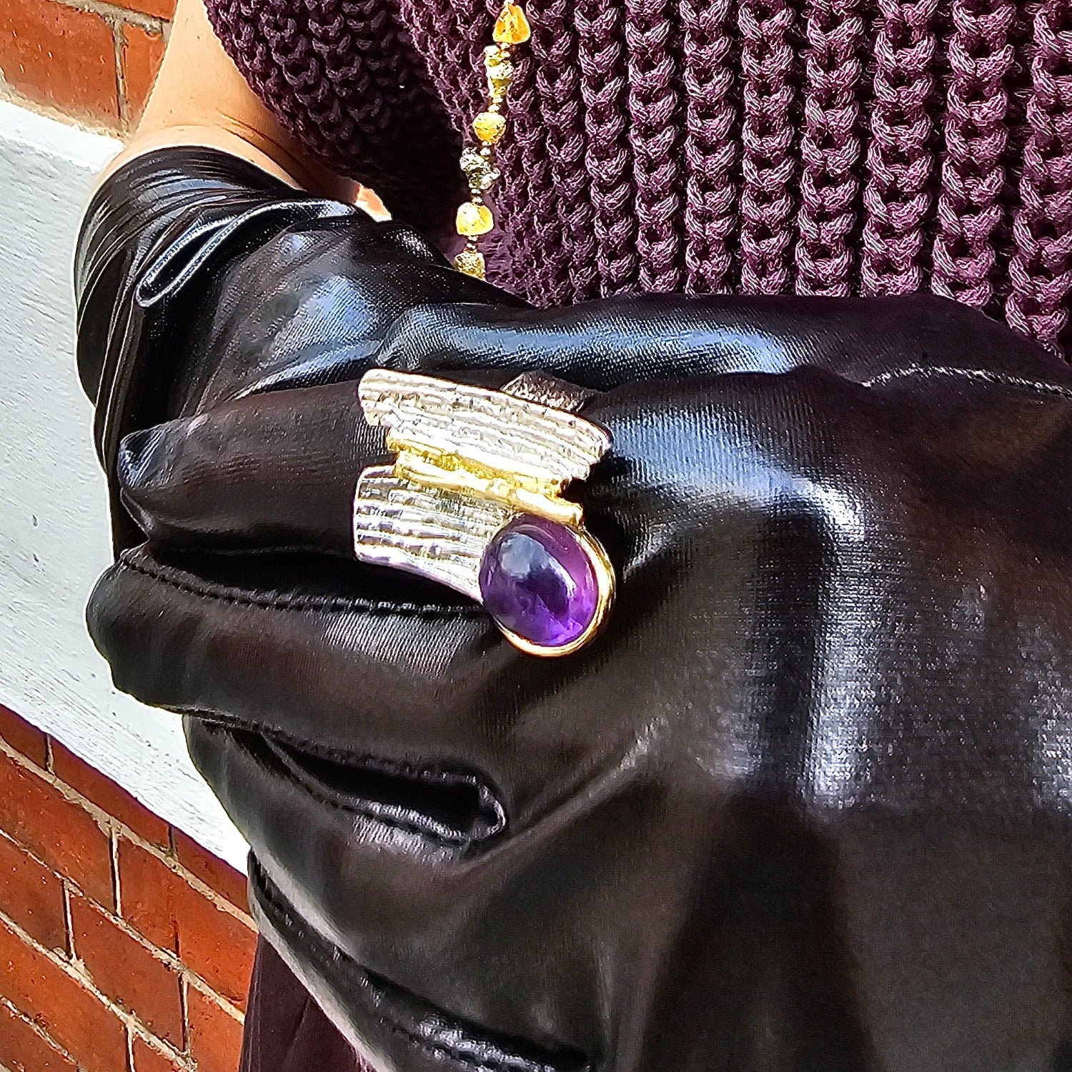 This adjustable ring is made of platinum plated brass and is set with an oval-shaped natural amethyst stone.