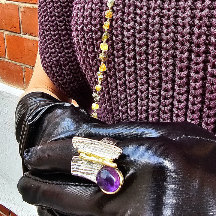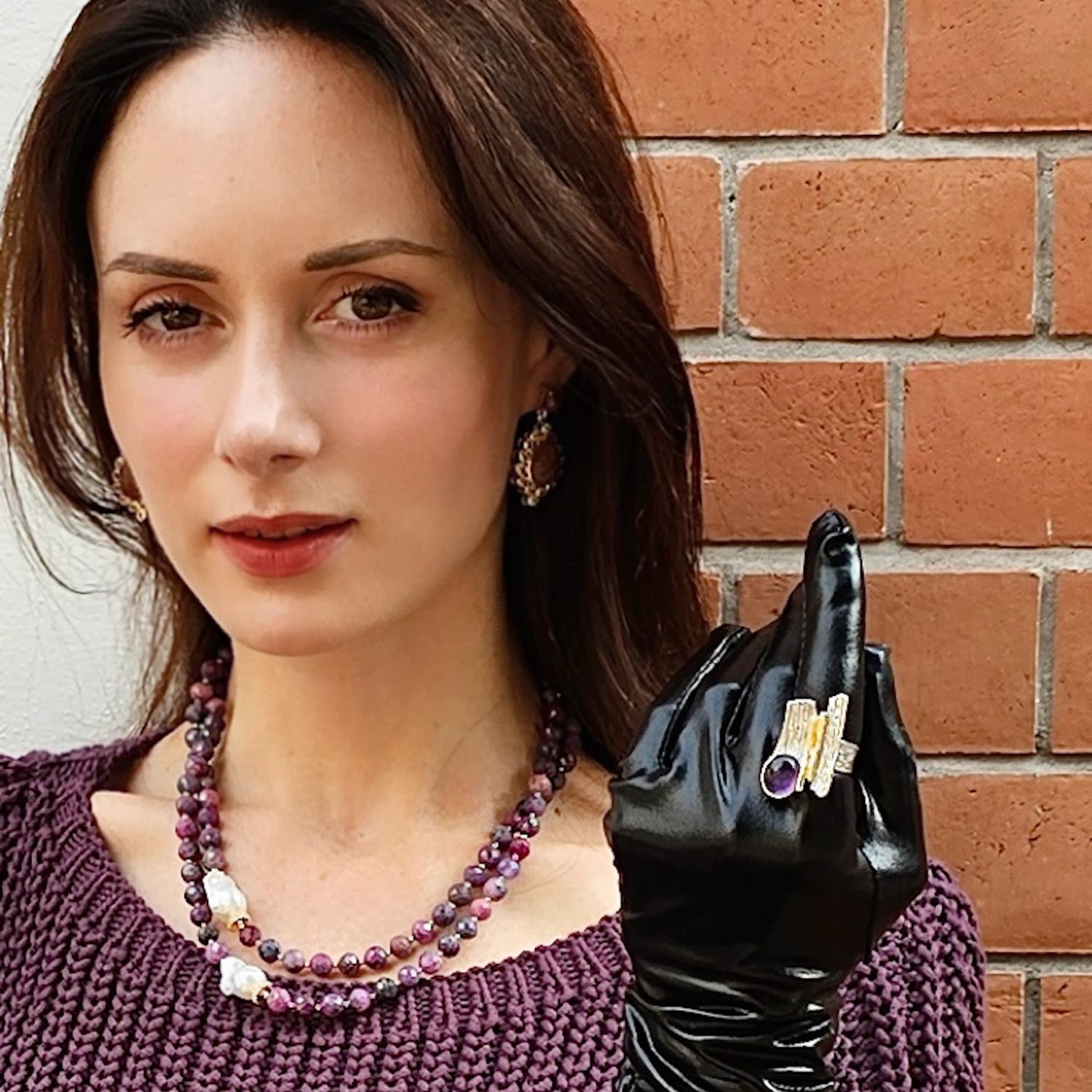 This Amethyst Stone Statement Ring by Farra is a versatile and elegant accessory. It features a striking oval-shaped natural amethyst at its center, the birthstone for February, beautifully complemented by a sleek band. The rich purple hue of the stone is a calming presence, promoting emotional balance. This adjustable ring can be worn alone for a dramatic effect or stacked for a trendy, layered look, making it perfect for both casual and formal occasions.