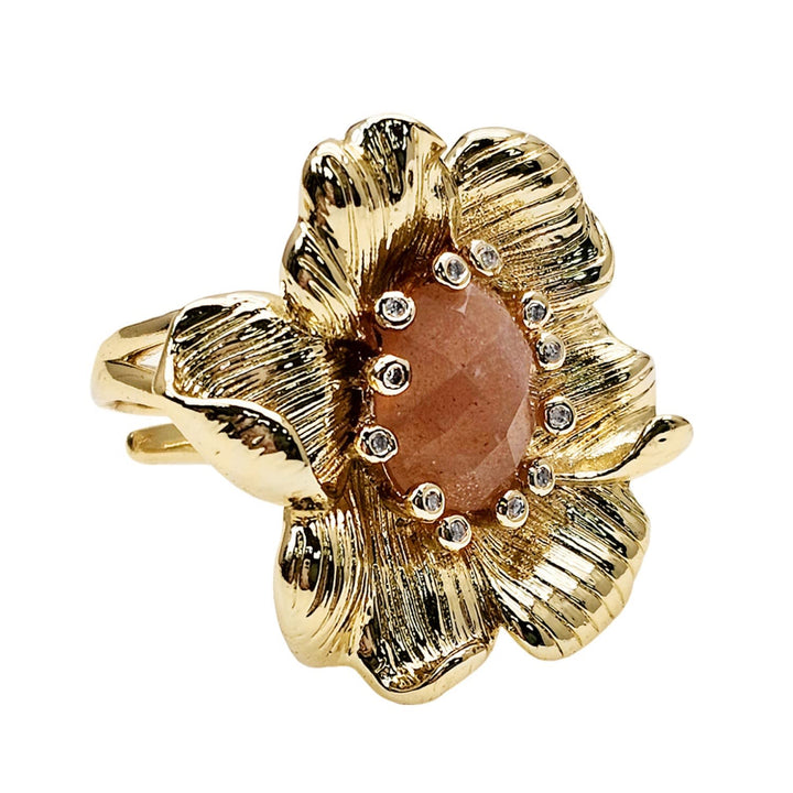 This cocktail ring is crafted from a gold-toned metal and features a central orange moonstone. It is set in a flower design with sparkling accents.