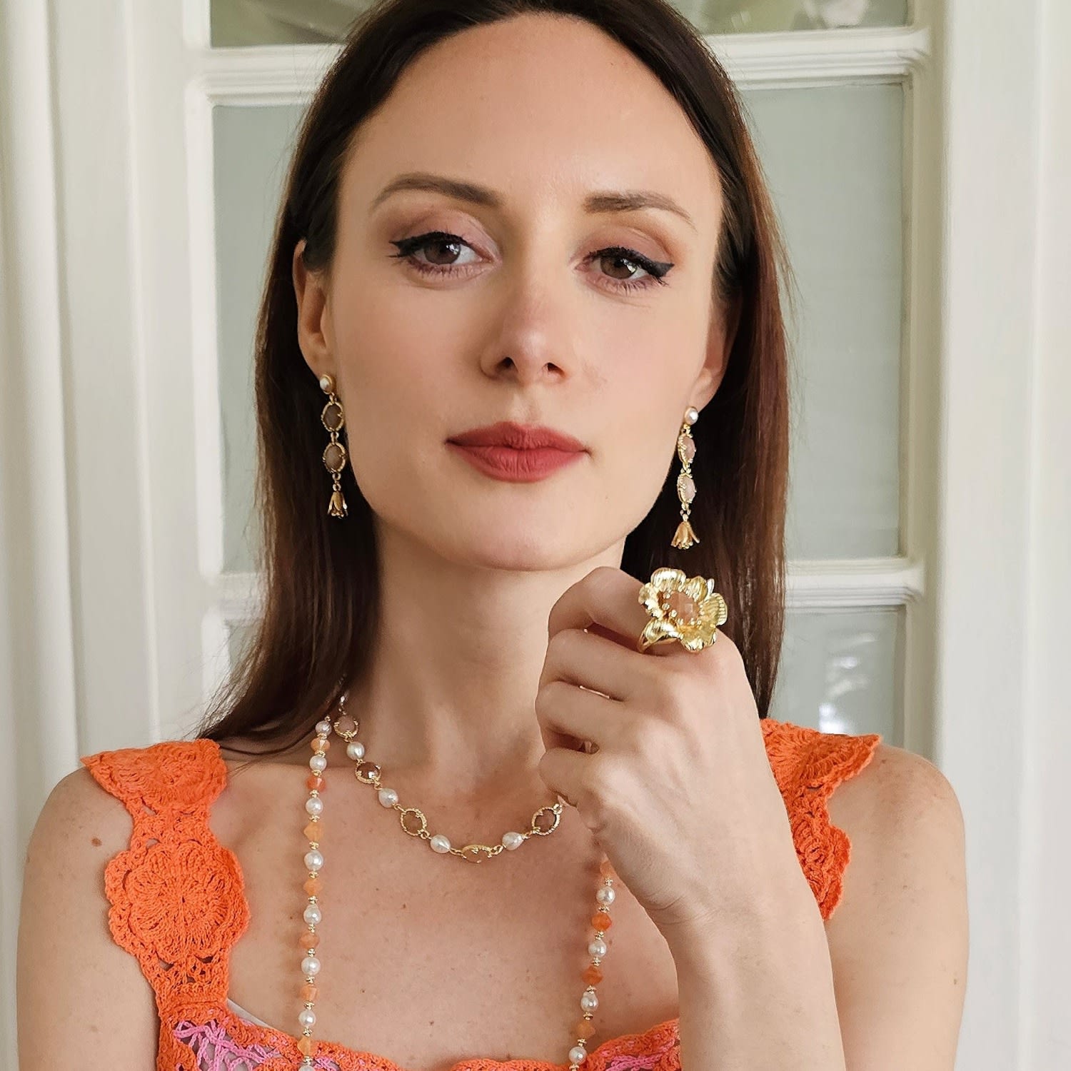 Gold Flower With Orange Moonstone Setting Cocktail Ring