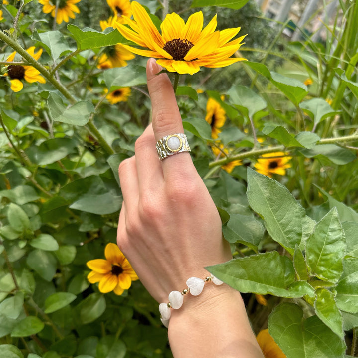 This adjustable ring is crafted from brass with platinum and 14K gold plating. It is set with a genuine white moonstone.