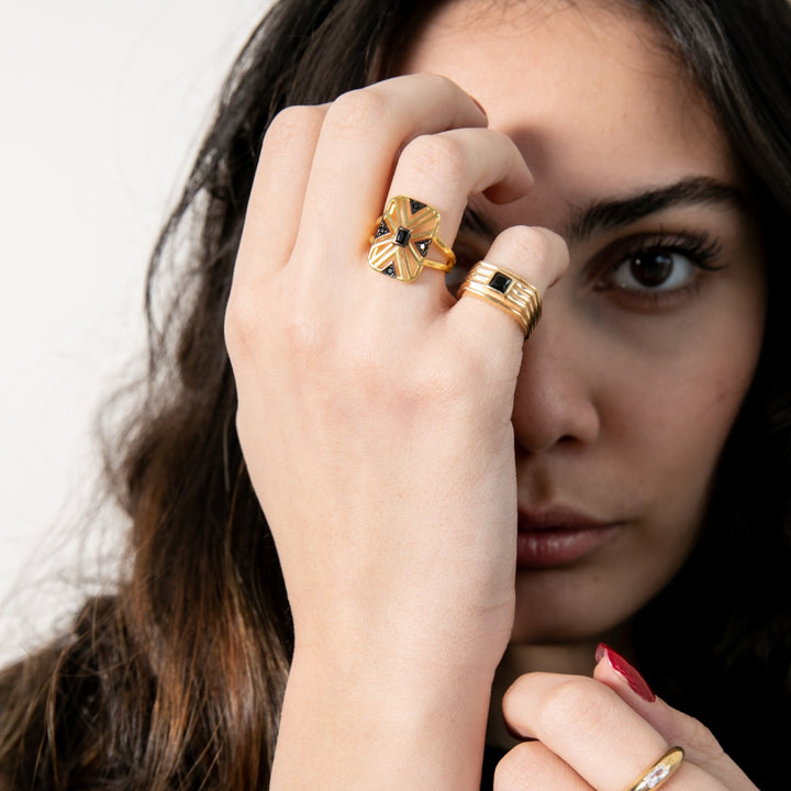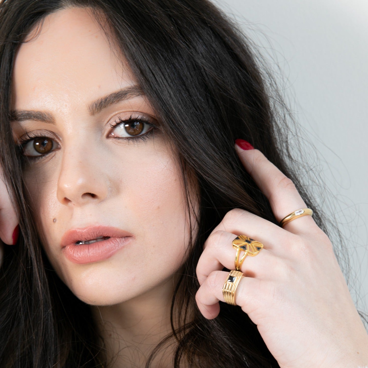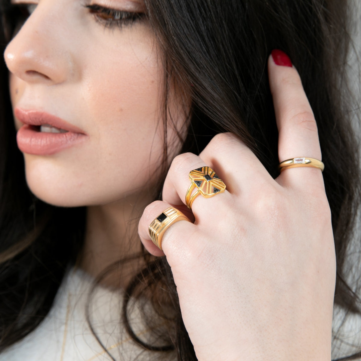 Mia is a ring that catches everyone's eyes with its unique design and exceptional craftsmanship. It's great for making a statement yet still practical for daily wear. Made from 925 sterling silver, this ring features cubic zirconia stone on its surface, providing a fantastic shine. The ring is gold-toned and 18K gold-plated.
