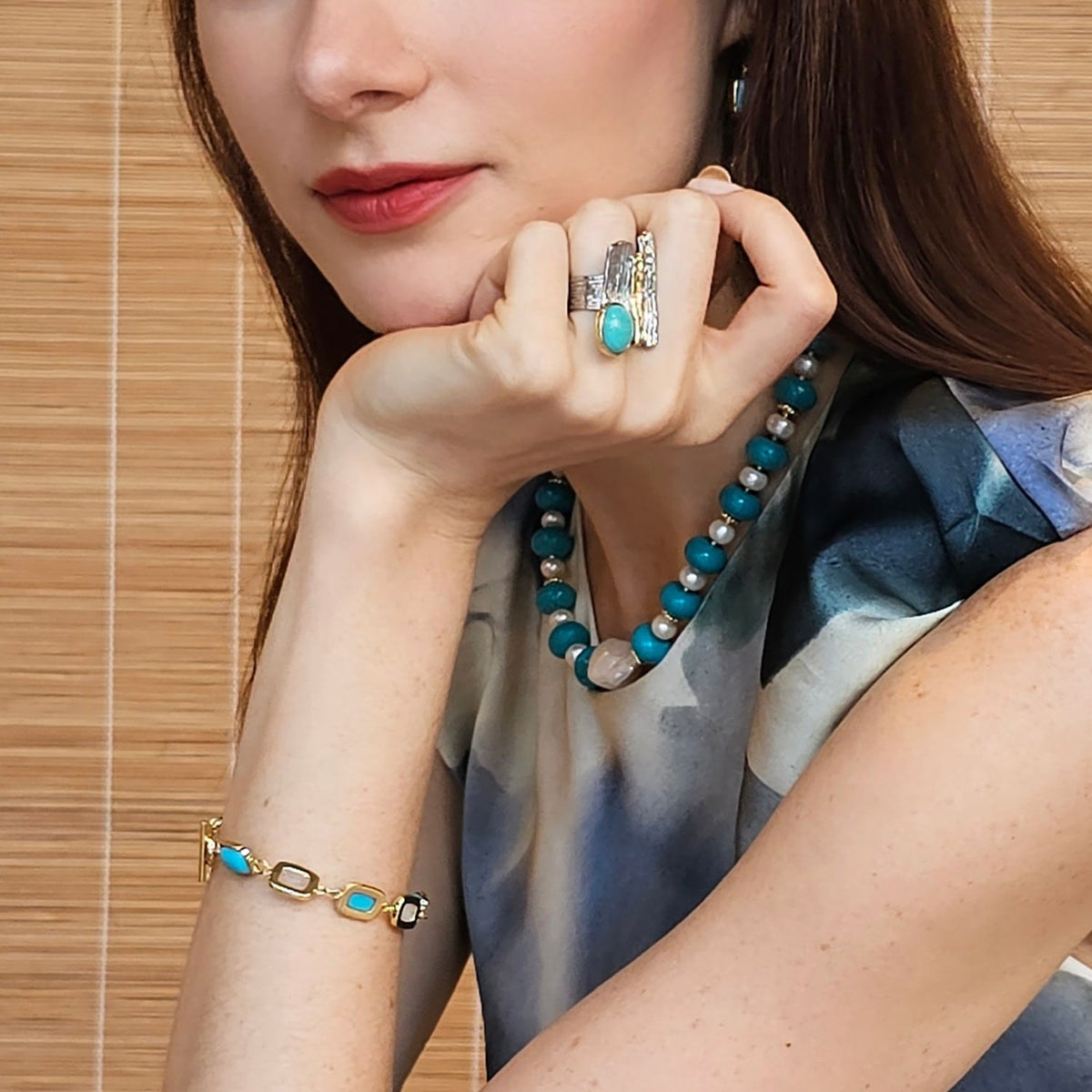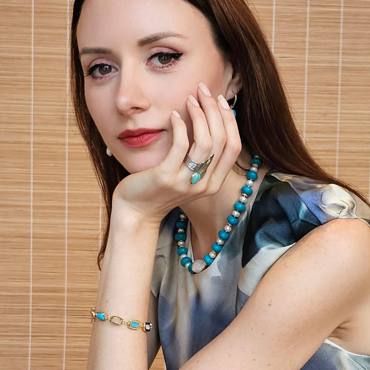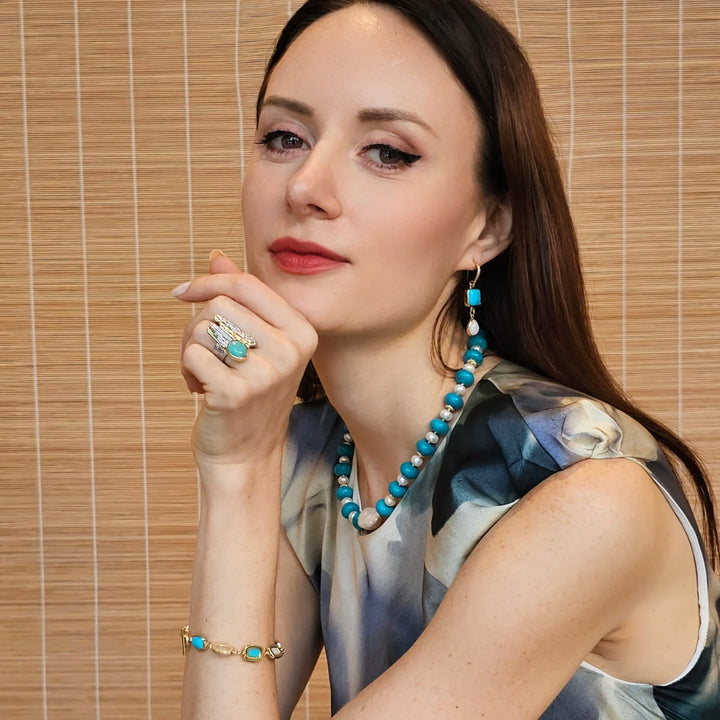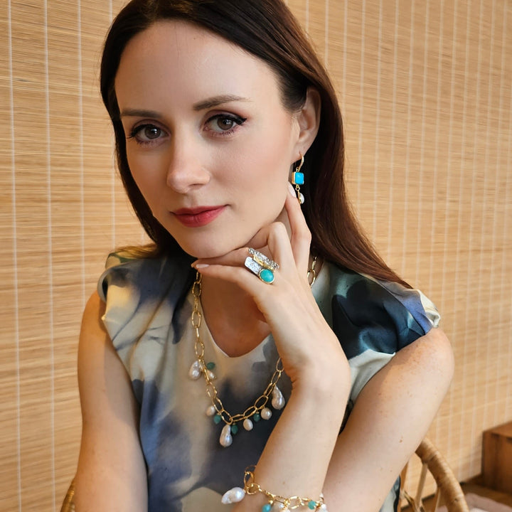 This statement ring is made with platinum-plated brass and is set with an amazonite stone and warm gold accents.
