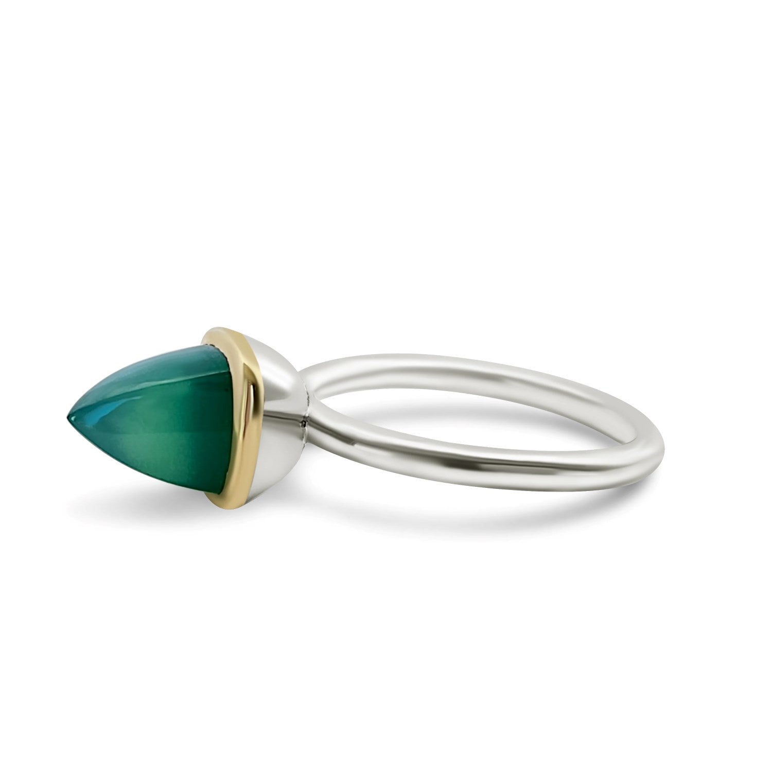 Sleek and elegant design of this Sugar-loaf ring makes it a beautiful and unique addition to any jewelry collection. With its clean, prong-free setting, the stone appears to be floating above a golden rim and allows us to truly notice its pointy beauty. The shank is round and smooth, made from solid14ct White Gold with 14ct Yellow Gold rim. Chalcedony (Chrysoprase) is is May birthstone believed to provide calmness, tranquility, and harmony. This ring can be worn alone and is also perfect for stacking. We believe passionately in creating a piece of jewelry you will love wearing, as much as we loved creating.