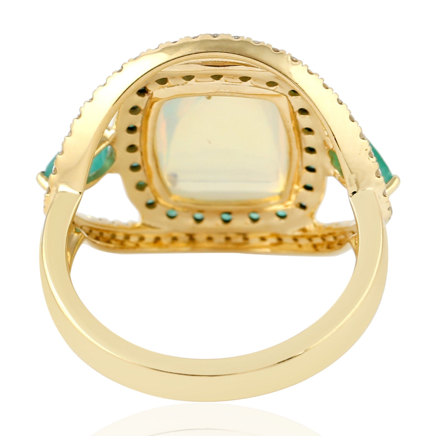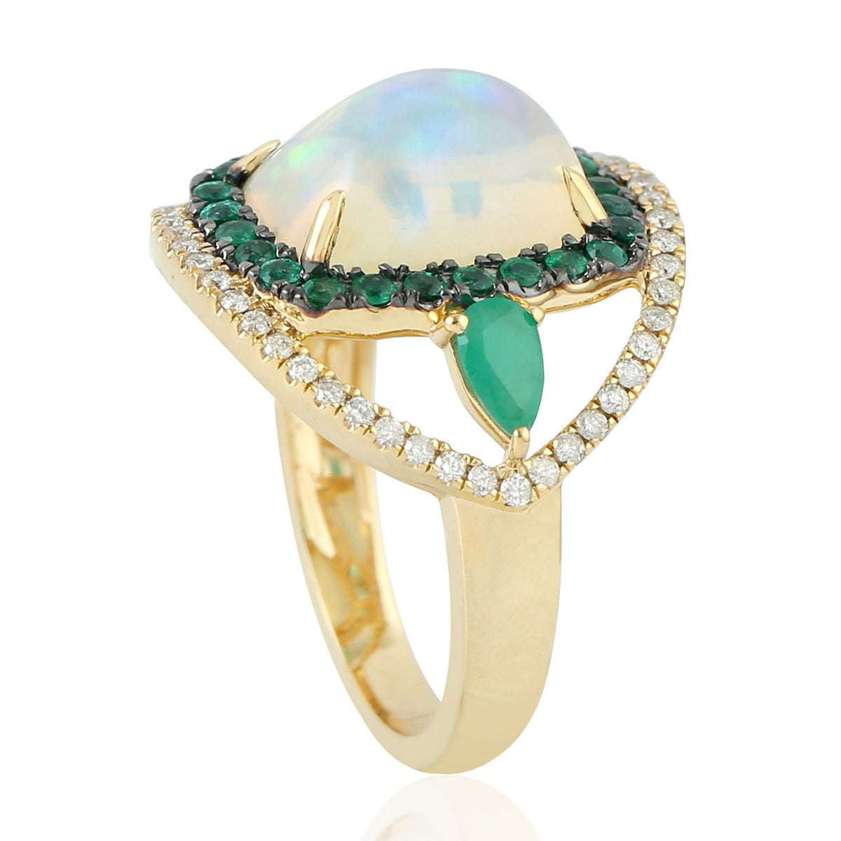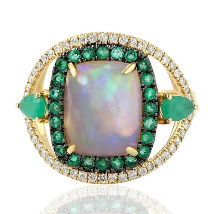 This Ring is handmade in 18k Yellow Gold, and Diamond: 0.32 cts, Ethiopian Opal: 2.68 cts, Emerald: 0.83 cts