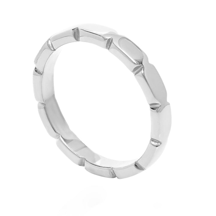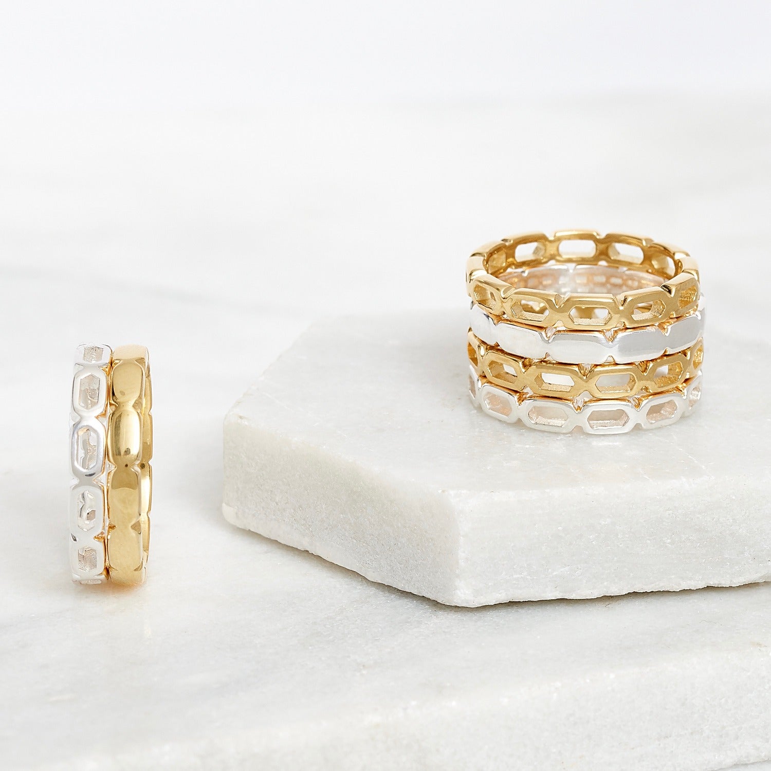 This stacking ring has an original design featuring hexagonal shapes. This handcrafted ring is made from Sterling Silver with a Rhodium plating to enhance and maintain the lustre of the silver. The clean, geometric lines make it a very versatile ring perfect on its own or stacked. We recommend mixing silver and gold, it makes the design stand out ev