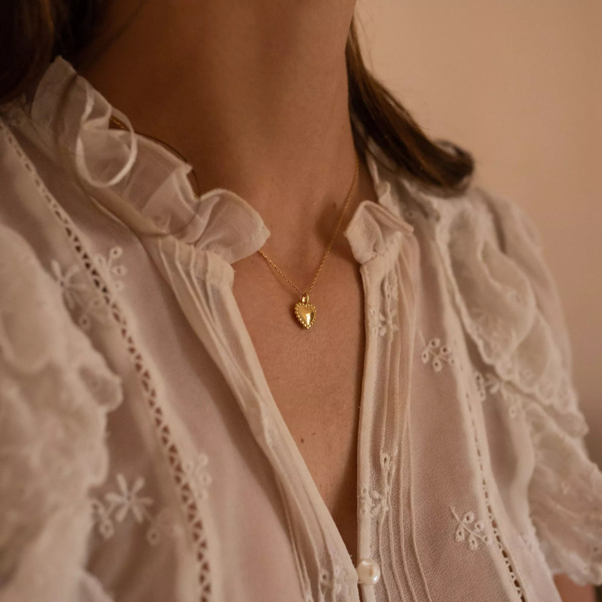 This Dainty Sterling Silver Heart Love Necklace by Elk & Bloom brings a sweet charm to everyday jewelry. Featuring a ribbed silver heart pendant suspended on a layered sterling silver chain, it’s a modern take on a classic symbol of love. Subtle yet impactful, it works beautifully alone or layered, offering a versatile piece that transitions effortlessly from day to evening with heartfelt style.