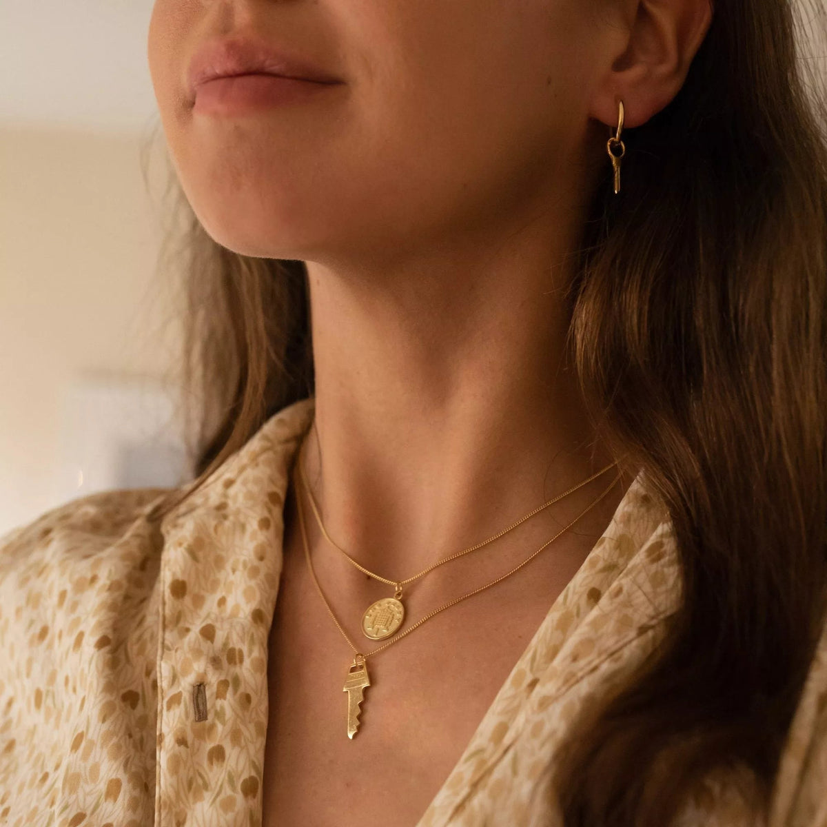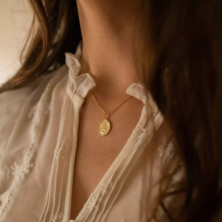 This necklace is made of solid sterling silver and is coated in genuine 18k gold plating. It features a double-sided coin medallion and an extender chain, measuring 44cm in total length.