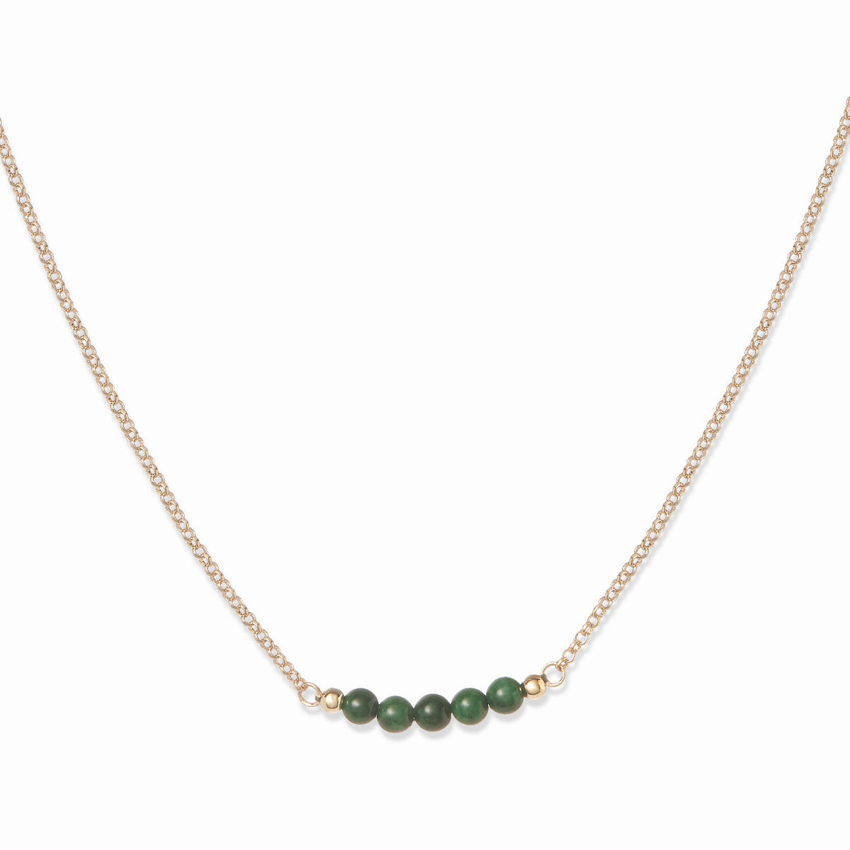 This necklace is 23 carat gold plated and features five Green Jadeite Chalcedony gemstones. It is 40 cm long.